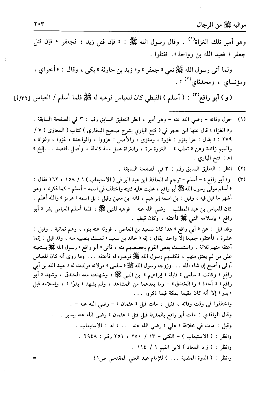 (3) و «أبو رافع» - أسلم- ترجم له الحافظ ابن عبد البر في (الاستيعاب) 1/ 158، 162 فقال: «أسلم مولى رسول الله صلى الله عليه وسلّم أبو رافع، غلبت عليه كنيته واختلف في اسمه- أسلم- كما ذكرنا، وهو أشهر ما قيل فيه، وقيل: بل اسمه إبراهيم، قاله ابن معين وقيل: بل اسمه «هرمز» والله أعلم. كان للعباس بن عبد المطلب- رضي الله عنه- فوهبه للنبي صلى الله عليه وسلّم، فلما أسلم العباس بشر «أبو رافع» بإسلامه النبي صلى الله عليه وسلّم فأعتقه، وكان قبطيا. وقد قيل: عن «أبي رافع» هذا كان لسعيد بن العاص، فورثه عنه بنوه، وهم ثمانية. وقيل: عشرة، فأعتقوه جميعا إلا واحدا يقال: إنه «خالد بن سعيد» تمسك بنصيبه منه، وقد قيل: إنما أعتقه منهم ثلاثة، واستمسك بعض القوم بحصصهم منه، فأتى «أبو رافع» رسول الله صلى الله عليه وسلّم يستعينه على من لم يعتق منهم، فكلمهم رسول الله صلى الله عليه وسلّم فوهبوه له فأعتقه ... وما روى أنه كان للعباس أولى وأصح إن شاء الله ... وزوجه رسول الله صلى الله عليه وسلّم «سلمى» مولاته فولدت له «عبيد الله بن أبي رافع» وكانت «سلمى» قابلة «إبراهيم» ابن النبي صلى الله عليه وسلّم، وشهدت معه الخندق، وشهد «أبو رافع» «أحدا» و «الخندق» - وما بعدهما من المشاهد، ولم يشهد «بدرا» ، وإسلامه قبل «بدر» إلا أنه كان مقيما بمكة فيما ذكروا ... واختلفوا في وقت وفاته، فقيل: مات قبل «عثمان» - رضي الله عنه-. وقال الواقدي: مات أبو رافع بالمدينة قبل قتل «عثمان» رضي الله عنه بيسير. وقيل: مات في خلافة «علي» رضي الله عنه ... » اه: الاستيعاب. وانظر: (الاستيعاب) - الكنى- 13/ 250، 251 رقم: 2948. وانظر: (زاد المعاد) لابن القيم 1/ 114. وانظر: (الدرة المضية ... ) للإمام عبد العني المقدسي ص 41.