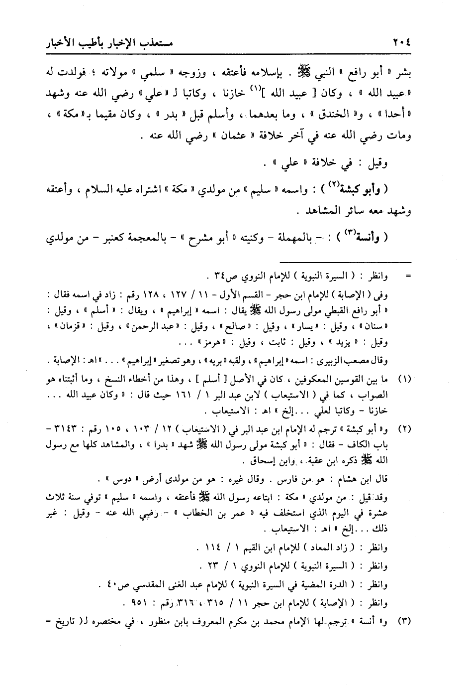 (2) و «أبو كبشة» ترجم له الإمام ابن عبد البر في (الاستيعاب) 12/ 103، 105 رقم: 3143- باب الكاف- فقال: «أبو كبشة مولى رسول الله صلى الله عليه وسلّم شهد «بدرا» ، والمشاهد كلها مع رسول الله صلى الله عليه وسلّم ذكره ابن عقبة، وابن إسحاق. قال ابن هشام: هو من فارس. وقال غيره: هو من مولدى أرض «دوس» . وقد قيل: من مولدي «مكة: ابتاعه رسول الله صلى الله عليه وسلّم فأعتقه، واسمه «سليم» توفي سنة ثلاث عشرة في اليوم الذي استخلف فيه «عمر بن الخطاب» - رضي الله عنه- وقيل: غير ذلك ... إلخ» اه: الاستيعاب. وانظر: (زاد المعاد) للإمام ابن القيم 1/ 114. وانظر: (السيرة النبوية) للإمام النووي 1/ 23. وانظر: (الدرة المضية في السيرة النبوية) للإمام عبد الغنى المقدسي ص 40. وانظر: (الإصابة) للإمام ابن حجر 11/ 315، 316 رقم: 951.