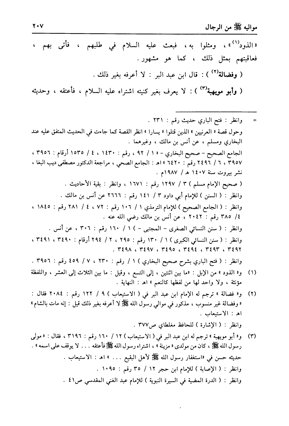 (3) و «أبو مويهبة» ترجم له ابن عبد البر في (الاستيعاب) 12/ 160 رقم: 3196، فقال: «مولى رسول الله صلى الله عليه وسلّم، كان من مولدى «مزينة» ، اشتراه رسول الله صلى الله عليه وسلّم فأعتقه ... لا يوقف على اسمه» . حديثه حسن في «استغفار رسول الله صلى الله عليه وسلّم لأهل البقيع ... » اه: الاستيعاب. وانظر: (الإصابة) للإمام ابن حجر 12/ 35 رقم: 1095. وانظر: (الدرة المضية في السيرة النبوية) للإمام عبد الغني المقدسي ص 41.