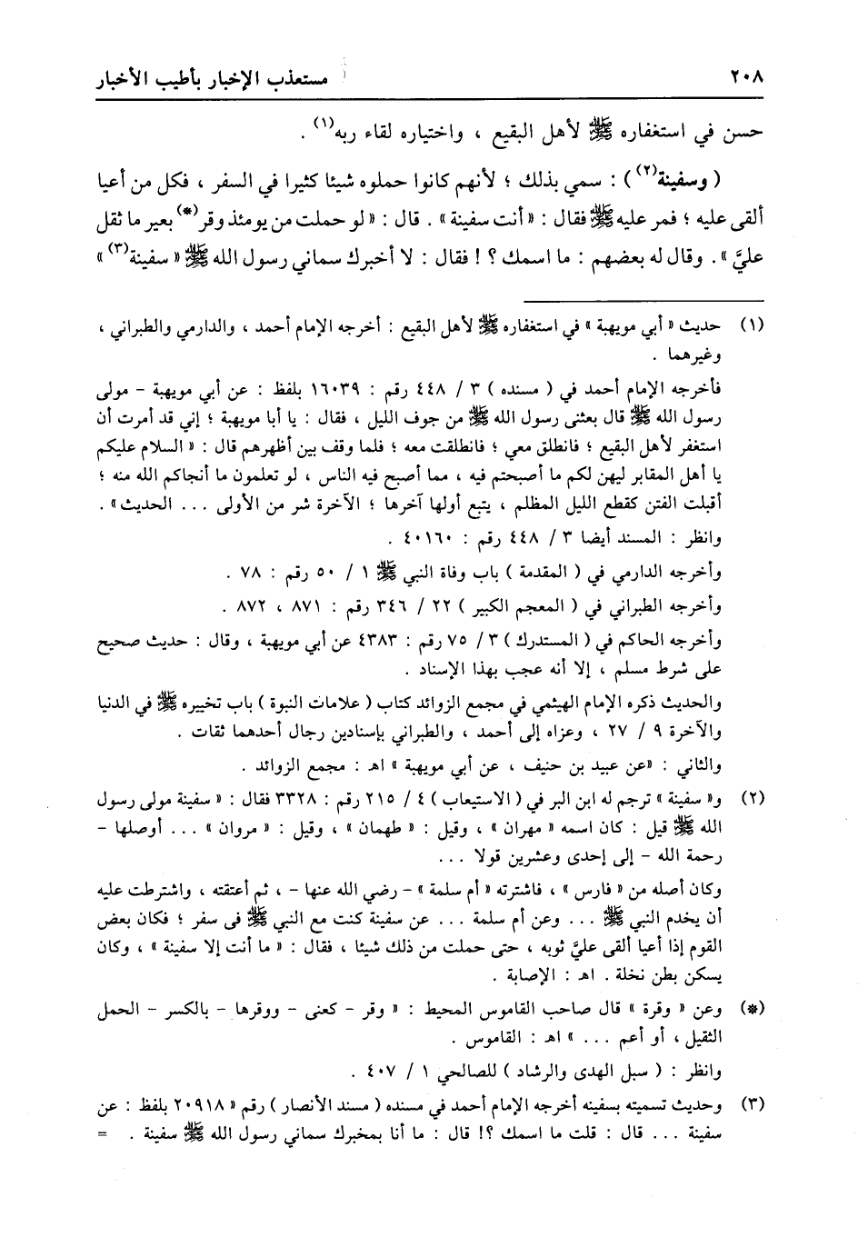 (1) حديث «أبي مويهبة» في استغفاره صلى الله عليه وسلّم لأهل البقيع: أخرجه الإمام أحمد، والدارمي والطبراني، وغيرهما. فأخرجه الإمام أحمد في (مسنده) 3/ 448 رقم: 16039 بلفظ: عن أبي مويهبة- مولى رسول الله صلى الله عليه وسلّم قال بعثنى رسول الله صلى الله عليه وسلّم من جوف الليل، فقال: يا أبا مويهبة؛ إني قد أمرت أن استغفر لأهل البقيع؛ فانطلق معي؛ فانطلقت معه؛ فلما وقف بين أظهرهم قال: «السلام عليكم يا أهل المقابر ليهن لكم ما أصبحتم فيه، مما أصبح فيه الناس، لو تعلمون ما أنجاكم الله منه؛ أقبلت الفتن كقطع الليل المظلم، يتبع أولها آخرها؛ الاخرة شر من الأولى ... الحديث» . وانظر: المسند أيضا 3/ 448 رقم: 40160. وأخرجه الدارمي في (المقدمة) باب وفاة النبي صلى الله عليه وسلّم 1/ 50 رقم: 78. وأخرجه الطبراني في (المعجم الكبير) 22/ 346 رقم: 871، 872. وأخرجه الحاكم في (المستدرك) 3/ 75 رقم: 4383 عن أبي مويهبة، وقال: حديث صحيح على شرط مسلم، إلا أنه عجب بهذا الإسناد. والحديث ذكره الإمام الهيثمي في مجمع الزوائد كتاب (علامات النبوة) باب تخييره صلى الله عليه وسلّم في الدنيا والاخرة 9/ 27، وعزاه إلى أحمد، والطبراني بإسنادين رجال أحدهما ثقات. والثاني: «عن عبيد بن حنيف، عن أبي مويهبة» اه: مجمع الزوائد.