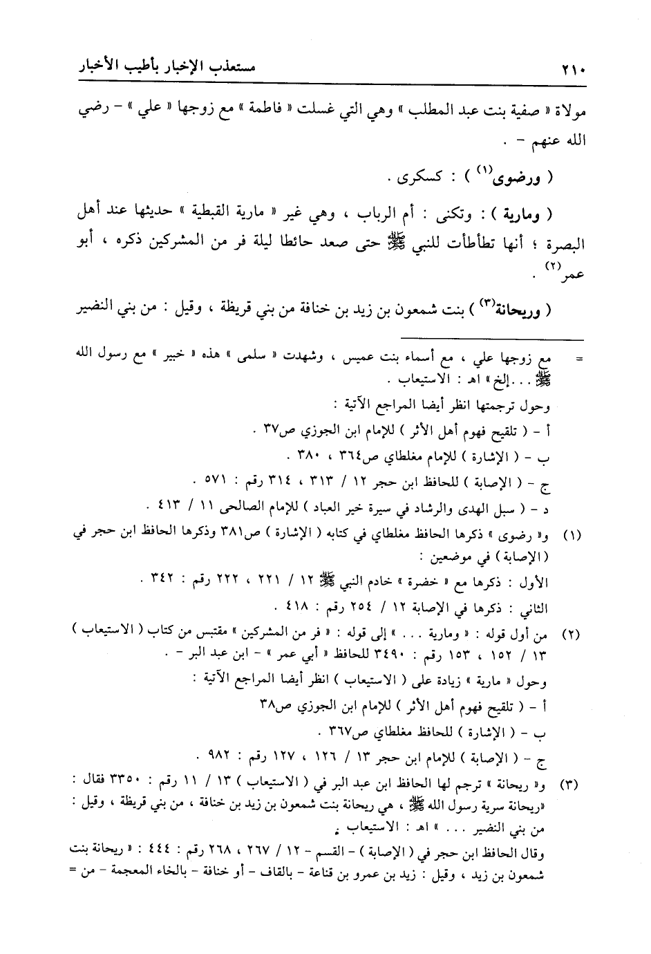(3) و «ريحانة» ترجم لها الحافظ ابن عبد البر في (الاستيعاب) 13/ 11 رقم: 3350 فقال: «ريحانة سرية رسول الله صلى الله عليه وسلّم، هي ريحانة بنت شمعون بن زيد بن خنافة، من بني قريظة، وقيل: من بني النضير ... » اه: الاستيعاب. وقال الحافظ ابن حجر في (الإصابة) - القسم- 12/ 267، 268 رقم: 444: «ريحانة بنت شمعون بن زيد، وقيل: زيد بن عمرو بن قناعة- بالقاف- أو خنافة- بالخاء المعجمة- من-