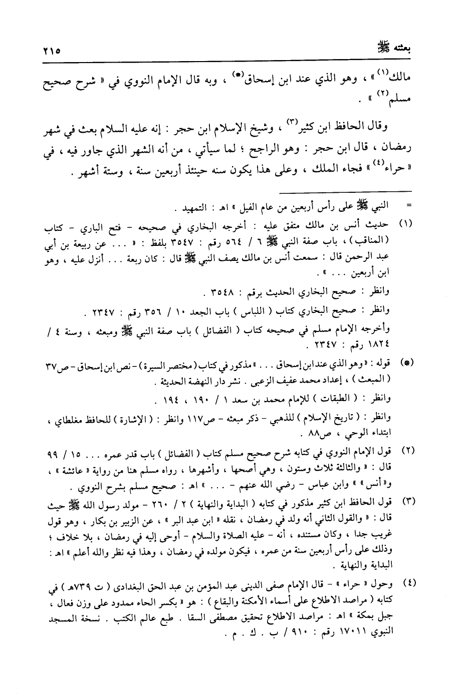 (*) قوله: «وهو الذي عند ابن إسحاق ... » مذكور في كتاب (مختصر السيرة) - نص ابن إسحاق- ص 37 (المبعث) ، إعداد محمد عفيف الزعبى. نشر دار النهضة الحديثة. وانظر: (الطبقات) للإمام محمد بن سعد 1/ 190، 194. وانظر: (تاريخ الإسلام) للذهبي- ذكر مبعثه- ص 117 وانظر: (الإشارة) للحافظ مغلطاي، ابتداء الوحي، ص 88.