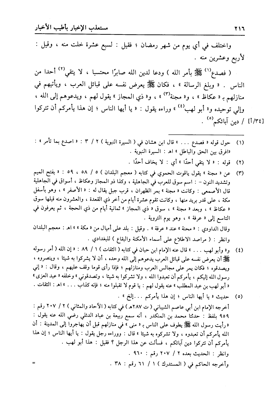 (5) حديث «يا أيها الناس؛ إن هذا يأمركم ... إلخ» . أخرجه الإمام ابن أبي عاصم الشيباني (ت 287 هـ) في كتابه (الاحاد والمثاني) 2/ 207 رقم: 959 بلفظ: حدثنا محمد بن المنكدر، أنه سمع ربيعة بن عباد الدئلي رضي الله عنه يقول: «رأيت رسول الله صلى الله عليه وسلّم يطوف على الناس ب «منى» في منازلهم قبل أن يهاجروا إلى المدينة: أن الله يأمركم أن تعبدوه، ولا تشركوه به شيئا» قال: ووراءه رجل يقول: يا أيها الناس؛ إن هذا يأمركم أن تتركوا دين آبائكم، فسألت عن هذا الرجل؟ فقيل: هذا أبو لهب. وانظر: الحديث بعده 2/ 207 رقم: 960. وأخرجه الحاكم في (المستدرك) 1/ 61 رقم: 38.