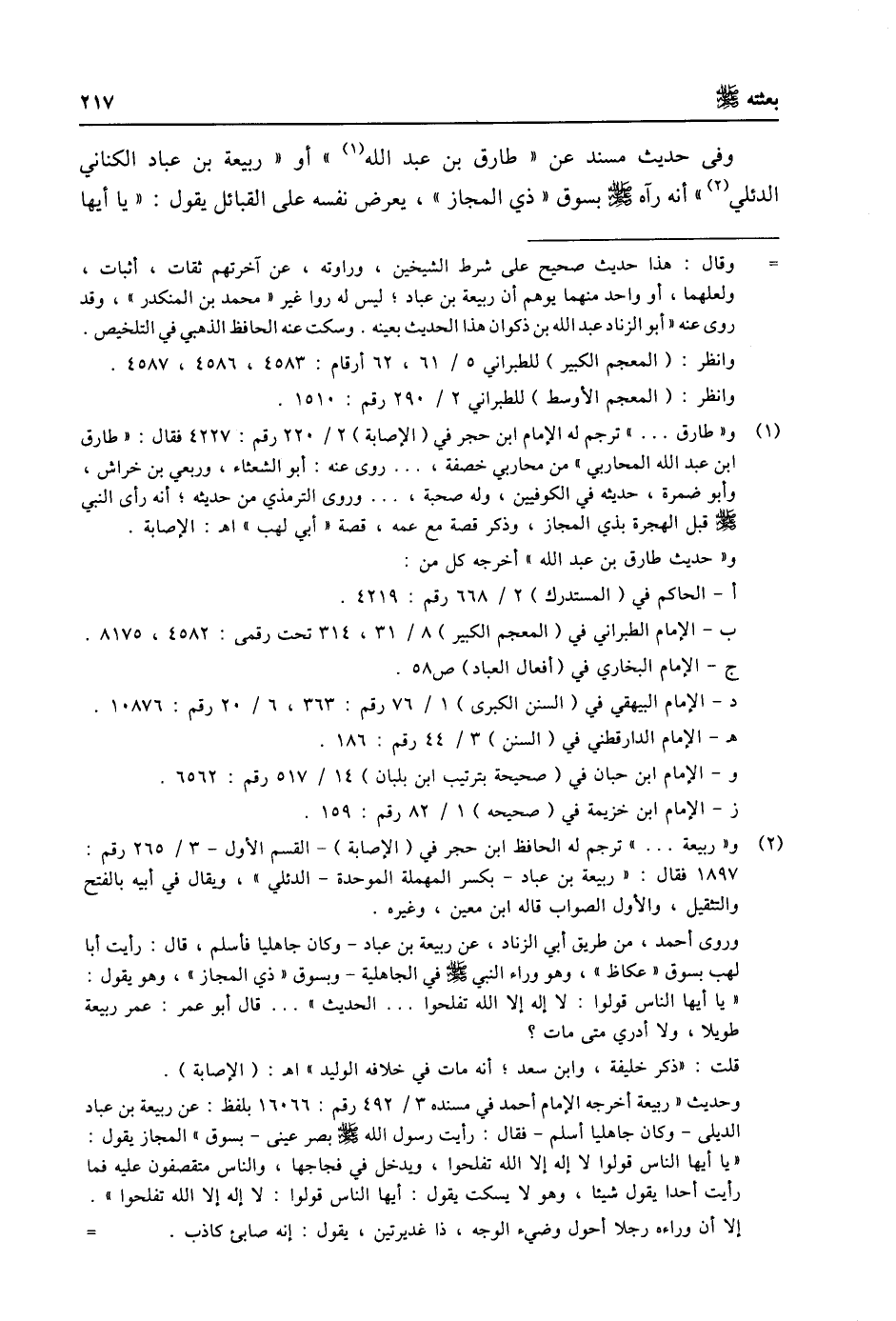 (1) و «طارق ... » ترجم له الإمام ابن حجر في (الإصابة) 2/ 220 رقم: 4227 فقال: «طارق ابن عبد الله المحاربي» من محاربي خصفة، ... روى عنه: أبو الشعثاء، وربعي بن خراش، وأبو ضمرة، حديثه في الكوفيين، وله صحبة، ... وروى الترمذي من حديثه؛ أنه رأى النبي صلى الله عليه وسلّم قبل الهجرة بذي المجاز، وذكر قصة مع عمه، قصة «أبي لهب» اه: الإصابة. و «حديث طارق بن عبد الله» أخرجه كل من: أ- الحاكم في (المستدرك) 2/ 668 رقم: 4219. ب- الإمام الطبراني في (المعجم الكبير) 8/ 31، 314 تحت رقمى: 4582، 8175. ج- الإمام البخاري في (أفعال العباد) ص 58. د- الإمام البيهقي في (السنن الكبرى) 1/ 76 رقم: 363، 6/ 20 رقم: 10876. هـ- الإمام الدارقطني في (السنن) 3/ 44 رقم: 186. والإمام ابن حبان في (صحيحة بترتيب ابن بلبان) 14/ 517 رقم: 6562. ز- الإمام ابن خزيمة في (صحيحه) 1/ 82 رقم: 159.