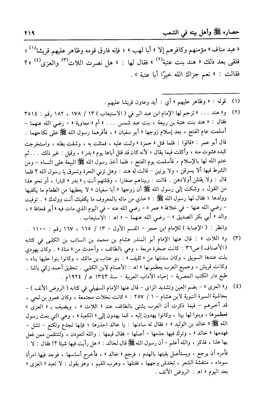 «عبد مناف» مؤمنهم وكافرهم إلا «أبا لهب» ؛ فإنه فارق قومه وظاهر عليهم قريشا «1» ؛ فلقى بعد ذلك «هند بنت عتبة «2» » فقال لها: «هل نصرت اللات «3» والعزى «4» » ؟