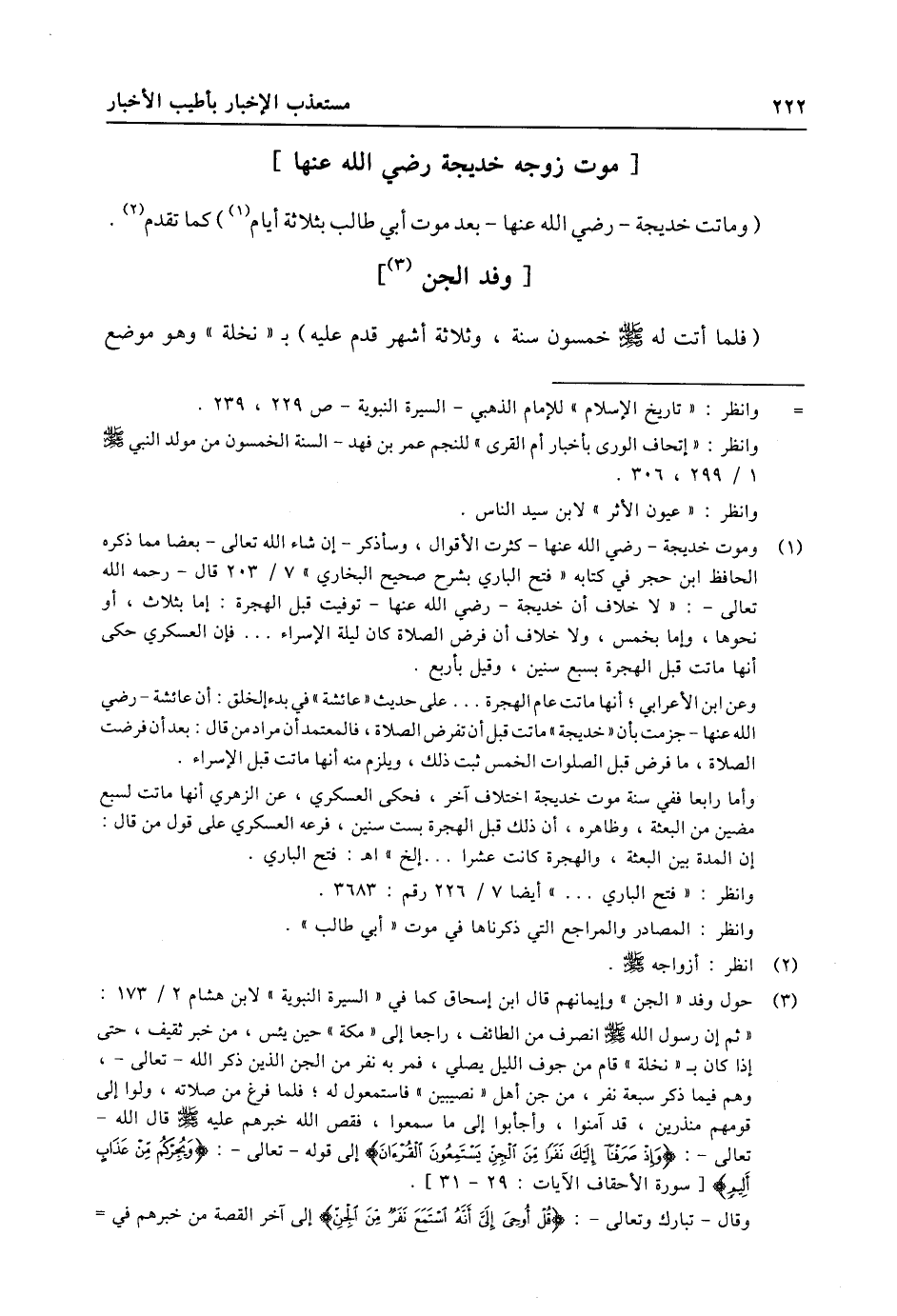 (3) حول وفد «الجن» وإيمانهم قال ابن إسحاق كما في «السيرة النبوية» لابن هشام 2/ 173: «ثم إن رسول الله صلى الله عليه وسلّم انصرف من الطائف، راجعا إلى «مكة» حين يئس، من خبر ثقيف، حتى إذا كان ب «نخلة» قام من جوف الليل يصلي، فمر به نفر من الجن الذين ذكر الله- تعالى-، وهم فيما ذكر سبعة نفر، من جن أهل «نصيبين» فاستمعول له؛ فلما فرغ من صلاته، ولوا إلى قومهم منذرين، قد آمنوا، وأجأبوا إلى ما سمعوا، فقص الله خبرهم عليه صلى الله عليه وسلّم قال الله- تعالى-: وَإِذْ صَرَفْنا إِلَيْكَ نَفَراً مِنَ الْجِنِّ يَسْتَمِعُونَ الْقُرْآنَ إلى قوله- تعالى-: وَيُجِرْكُمْ مِنْ عَذابٍ أَلِيمٍ [سورة الأحقاف الايات: 29- 31] . وقال- تبارك وتعالى-: قُلْ أُوحِيَ إِلَيَّ أَنَّهُ اسْتَمَعَ نَفَرٌ مِنَ الْجِنِّ إلى آخر القصة من خبرهم في-