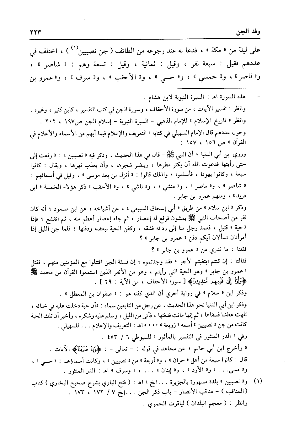 - هذه السورة اه: السيرة النبوية لابن هشام. وانظر: تفسير الايات، من سورة الأحقاف، وسورة الجن في كتب التفسير، كابن كثير، وغيره. وانظر «تاريخ الإسلام» للإمام الذهبي- السيرة النبوية- إسلام الجن ص 197، 202. وحول عددهم قال الإمام السهيلي في كتابه «التعريف والإعلام فيما أبهم من الأسماء والأعلام في القرآن» ص 156، 157: وروي ابن أبي الدنيا؛ أن النبي صلى الله عليه وسلّم- قال في هذا الحديث، وذكر فيه «نصيبين» : «رفعت إلى حتى رأيتها فدعوت الله أن يكثر مطرها، وينضر شجرها، وأن يعذب نهرها، ويقال: كانوا سبعة، وكانوا يهودا، فأسلموا؛ ولذلك قالوا: «أنزل من بعد موسى» ، وقيل في أسمائهم: «شاصر» ، و «ماصر» ، و «منشي» ، و «ناشي» ، و «الأحقب» ذكر هؤلاء الخمسة «ابن دريد» ، ومنهم عمرو بن جابر. وذكر «ابن سلام» من طريق «أبي إسحاق السبيعي» ، عن أشياخه، عن ابن مسعود؛ أنه كان نفر من أصحاب النبي صلى الله عليه وسلّم يمشون فرفع له إعصار، ثم جاء إعصار أعظم منه، ثم انقشع؛ فإذا «حية» قتيل، فعمد رجل منا إلى ردائه فشقه، وكفن الحية ببعضه ودفنها؛ فلما جن الليل إذا أمرأتان تسألان أيكم دفن «عمرو بن جابر» ؟ فقلنا: ما ندري من «عمرو بن جابر» ؟ فقالتا: إن كنتم ابتغيتم الأجر؛ فقد وجدتموه؛ إن فسقة الجن اقتتلوا مع المؤمنين منهم، فقتل «عمرو بن جابر» وهو الحية التي رأيتم، وهو من الأنفر الذين استمعوا القرآن من محمد صلى الله عليه وسلّم وَلَّوْا إِلى قَوْمِهِمْ مُنْذِرِينَ [سورة الأحقاف، من الاية: 29] . وذكر ابن «سلام» في رواية أخري أن الذي كفنه هو: «صفوان بن المعطل» . وذكر ابن أبي الدنيا نحو هذا الحديث، عن رجل من التابعين سماه: «أن حية دخلت عليه في خبائه، تلهث عطشا فسقاها، ثم إنها ماتت فدفنها، فأتي من الليل، وسلم عليه وشكره، وأخبر أن تلك الحية كانت من جن «نصيبين» أسمه «زوبعة» ... » اه: التعريف والإعلام ... للسهيلي. وفي «الدر المنثور في التفسير بالمأثور» للسيوطي 6/ 453. «وأخرج ابن أبي حاتم؛ عن مجاهد في قوله: - تعالى-: وَإِذْ صَرَفْنا الايات. قال: كانوا سبعة من أهل «حران» ، و «أربعة» من «نصيبين» ، وكانت أسماؤهم: «حسي» ، و «مسى ... » و «الأرد» ، و «إينان» ... ، «وسرف» اه: الدر المنثور.