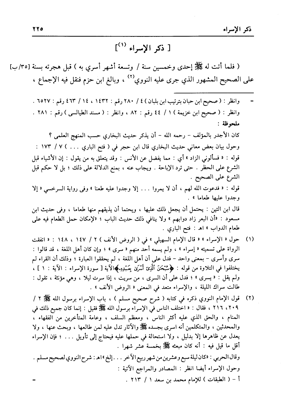 (1) حول «الإسراء» «قال الإمام السهيلي» في (الروض الأنف) 2/ 147، 148: «اتفقت الرواة على تسميته «إسراء» ، ولم يسمه أحد منهم «سرى» ؛ وإن كان أهل اللغة، قد قالوا: سرى وأسرى- بمعنى واحد- فدل على أن أهل اللغة، لم يحققوا العبارة؛ وذلك أن القراء لم يختلفوا في التلاوة من قوله: سُبْحانَ الَّذِي أَسْرى بِعَبْدِهِ الاية [سورة الإسراء: الاية: 1] ، ولم يقل: «يسرى» ؛ فدل على أن السرى، من سريت، إذا سرت ليلا، وهي مؤنثة، تقول: طالت سراك الليلة، والإسراء متعد في المعنى «الروض الأنف» .