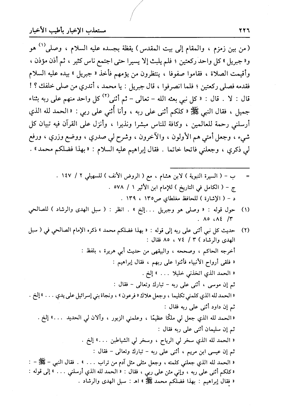 (2) حديث كل نبي أثنى على ربه إلى قوله: «بهذا فضلكم محمد» ذكره الإمام الصالحي في (سبل الهدى والرشاد) 3/ 74، 85 فقال: أخرجه الحاكم، وصححه، والبيقهى من حديث أبي هريرة، بلفظ: «فلقى أرواح الأنبياء فأثنوا على ربهم، فقال إبراهيم: «الحمد الذي اتخذني خليلا ... » إلخ. ثم إن موسى، أثنى على ربه- تبارك وتعالى- فقال: «الحمد لله الذي كلمني تكليما، وجعل هلاك «فرعون» ، ونجاة بني إسرائيل على يدي ... » إلخ. ثم إن داود أثنى على ربه فقال: «الحمد لله الذي جعل لي ملكا عظيما، وعلمني الزبور، وألان لي الحديد ... » إلخ. ثم إن سليمان أثنى على ربه فقال: «الحمد لله الذي سخر لي الرياح، وسخر لي الشياطين ... » إلخ. ثم إن عيسى ابن مريم، أثنى على ربه- تبارك وتعالى- فقال: «الحمد لله الذي جعلني كلمته، وجعل مثلى مثل آدم من تراب ... » . فقال النبي- عليه السّلام-: «كلكم أثنى على ربه، وإني مثن على ربي، فقال: «الحمد لله الذي أرسلني ... » إلى قوله: «فقال إبراهيم: بهذا فضلكم محمد صلى الله عليه وسلّم» اه: سبل الهدى والرشاد.