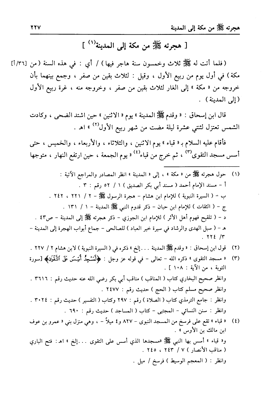 (1) حول هجرته صلى الله عليه وسلّم من «مكة» ، إلى «المدينة» انظر المصادر والمراجع الاتية: أ- مسند الإمام أحمد (مسند أبي بكر الصديق) 1/ 52 رقم: 3. ب- (السيرة النبوية) للإمام ابن هشام- هجرة الرسول صلى الله عليه وسلّم- 2/ 221، 242. ج- (الثقات) للإمام ابن حبان- ذكر قدوم النبي صلى الله عليه وسلّم المدينة- 1/ 131. د- (تلقيح فهوم أهل الأثر) للإمام ابن الجوزي- ذكر هجرته صلى الله عليه وسلّم إلى المدينة- ص 43. هـ- (سبل الهدى والرشاد في سيرة خير العباد) للصالحى- جماع أبواب الهجرة إلى المدينة- 3/ 224.