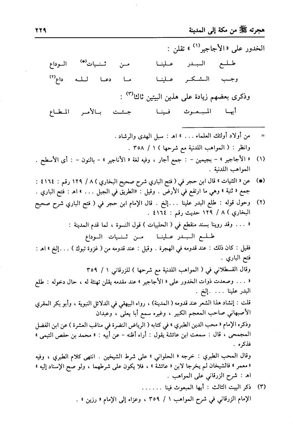 (2) وحول قوله: طلع البدر علينا ... إلخ. قال الإمام ابن حجر في (فتح الباري شرح صحيح البخاري) 8/ 129 حديث رقم: 4164. « ... وقد روينا بسند منقطع في (الحلبيات) قول النسوة، لما قدم المدينة: