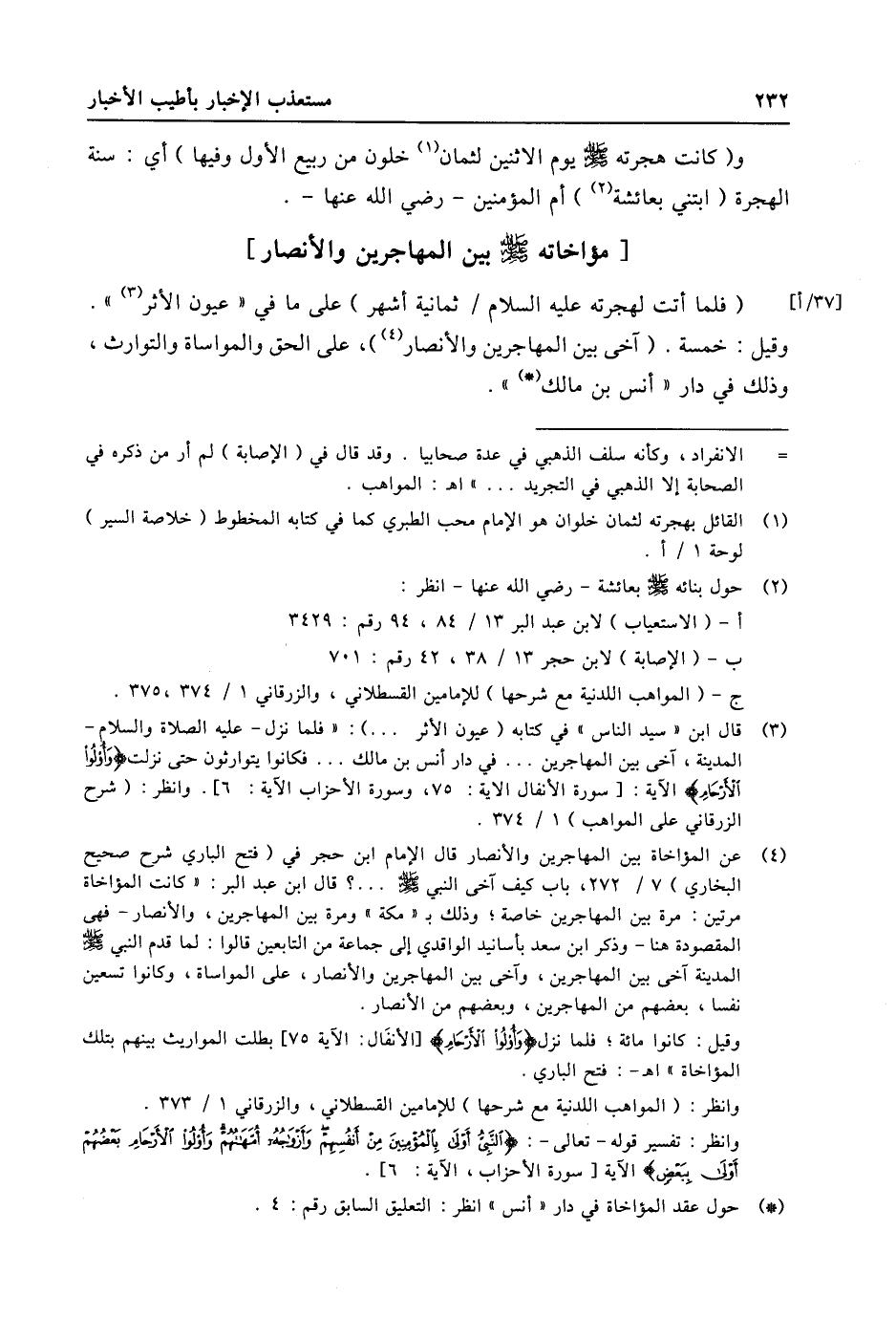 (4) عن المؤاخاة بين المهاجرين والأنصار قال الإمام ابن حجر في (فتح الباري شرح صحيح البخاري) 7/ 272، باب كيف آخى النبي صلى الله عليه وسلّم ... ؟ قال ابن عبد البر: «كانت المؤآخاة مرتين: مرة بين المهاجرين خاصة؛ وذلك ب «مكة» ومرة بين المهاجرين، والأنصار- فهى المقصودة هنا- وذكر ابن سعد بأسانيد الواقدي إلى جماعة من التابعين قالوا: لما قدم النبي صلى الله عليه وسلّم المدينة آخى بين المهاجرين، وآخى بين المهاجرين والأنصار، على المواساة، وكانوا تسعين نفسا، بعضهم من المهاجرين، وبعضهم من الأنصار. وقيل: كانوا مائة؛ فلما نزل وَأُولُوا الْأَرْحامِ [الأنفال: الاية 75] بطلت المواريث بينهم بتلك المؤاخاة» اه-: فتح الباري. وانظر: (المواهب اللدنية مع شرحها) للإمامين القسطلاني، والزرقاني 1/ 373. وانظر: تفسير قوله- تعالى-: النَّبِيُّ أَوْلى بِالْمُؤْمِنِينَ مِنْ أَنْفُسِهِمْ وَأَزْواجُهُ أُمَّهاتُهُمْ وَأُولُوا الْأَرْحامِ بَعْضُهُمْ أَوْلى بِبَعْضٍ الاية [سورة الأحزاب، الاية: 6] .
