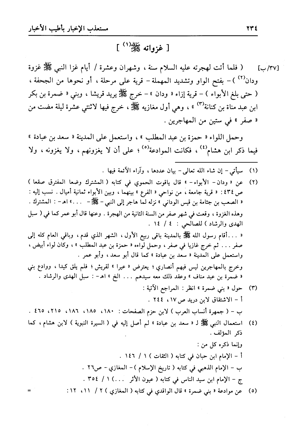 (2) عن «ودان- الأبواء-» قال ياقوت الحموي في كتابه (المشترك وضعا المفترق صقعا) ص 434: «قرية جامعة، من نواحي «الفرع» بينهما، وبين الأبواء ثمانية أميال. نسب إليه: «الصعب بن جثامة بن قيس الوداني» نزله لما هاجر إلى النبي- صلى الله عليه وسلّم- ... » اه-: المشترك. وهذه الغزوة، وقعت في شهر صفر من السنة الثانية من الهجرة. وعنها قال أبو عمر كما في (سبل الهدى والرشاد) للصالحي: 4/ 14. « ... أقام رسول الله صلى الله عليه وسلّم بالمدينة باقى ربيع الأول، الشهر الذي قدم، وباقي العام كله إلى صفر ... ثم خرج غازيا في صفر، وحمل لواءه «حمزة بن عبد المطلب» ، وكان لواء أبيض، واستعمل على المدينة «سعد بن عبادة» كما قال أبو سعد، وأبو عمر. وخرج بالمهاجرين ليس فيهم أنصاري؛ يعترض «عيرا» لقريش؛ فلم يلق كيدا، ووادع بني «ضمرة بن عبد مناف» وعقد ذلك معه سيدهم ... الخ» اه-: سبل الهدى والرشاد.