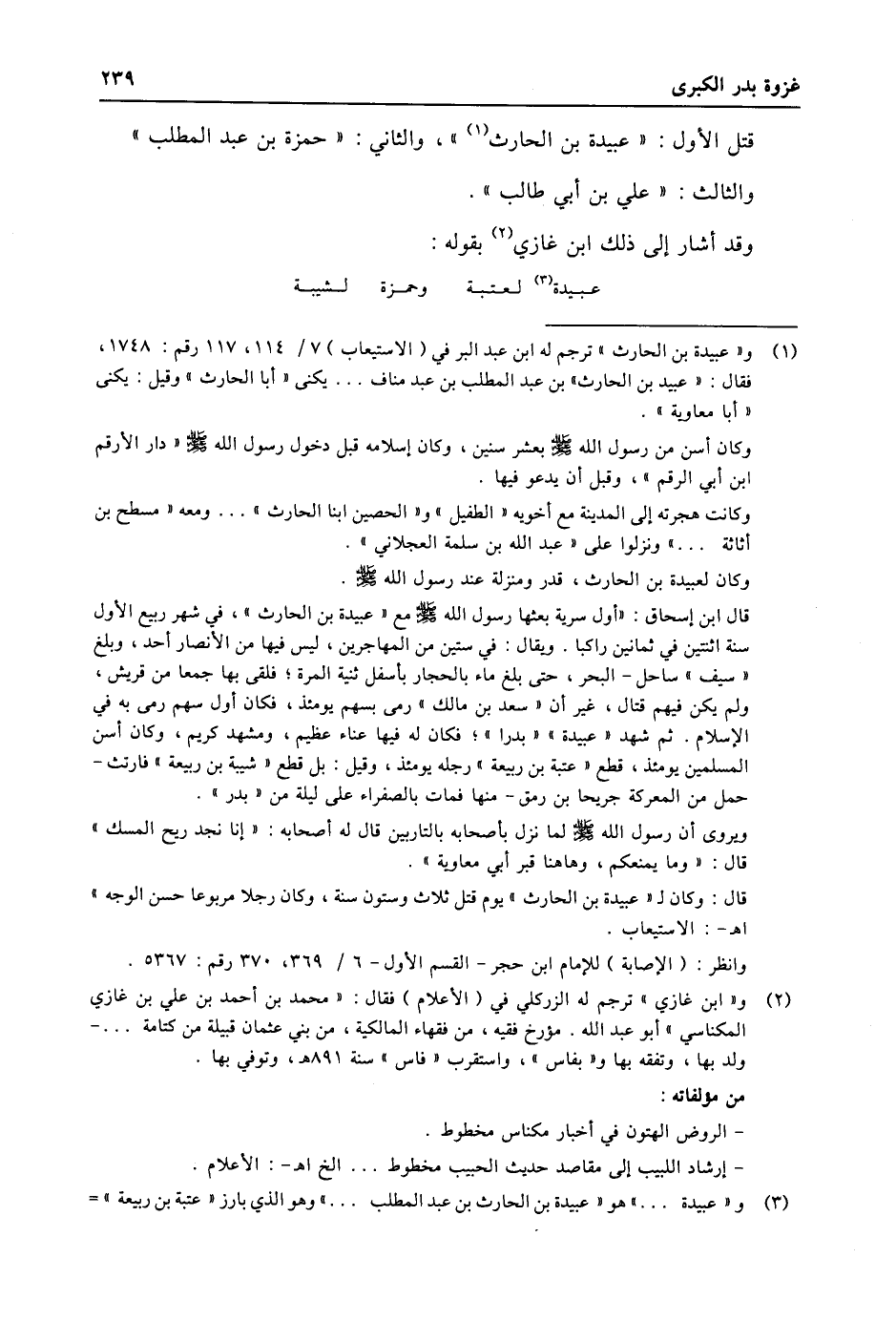 (3) و «عبيدة ... » هو «عبيدة بن الحارث بن عبد المطلب ... » وهو الذي بارز «عتبة بن ربيعة» -
