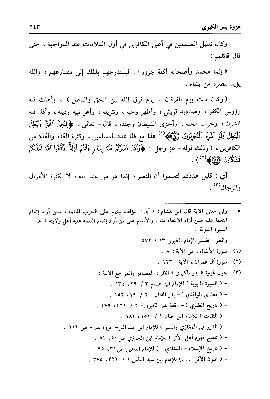 (3) حول غزوة «بدر الكبرى» انظر: المصادر والمراجع الاتية: - (السيرة النبوية) للإمام ابن هشام 3/ 29، 134. - (مغازي الواقدي) - بدر القتال- 2/ 19، 152. - (تاريخ الطبري) - وقعة بدر الكبرى- 2/ 421، 479. - (الثقات) للإمام ابن حبان 1/ 152، 182. - (الدرر في المغازي والسير) للإمام ابن عبد البر- غزوة بدر- ص 112. - (تلقيح فهوم أهل الأثر) للإمام ابن الجوزي ص 50، 51. - (تاريخ الإسلام- المغازي-) للإمام الذهبي ص 31، 95. - (عيون الأثر ... ) للإمام ابن سيد الناس 1/ 322، 375.