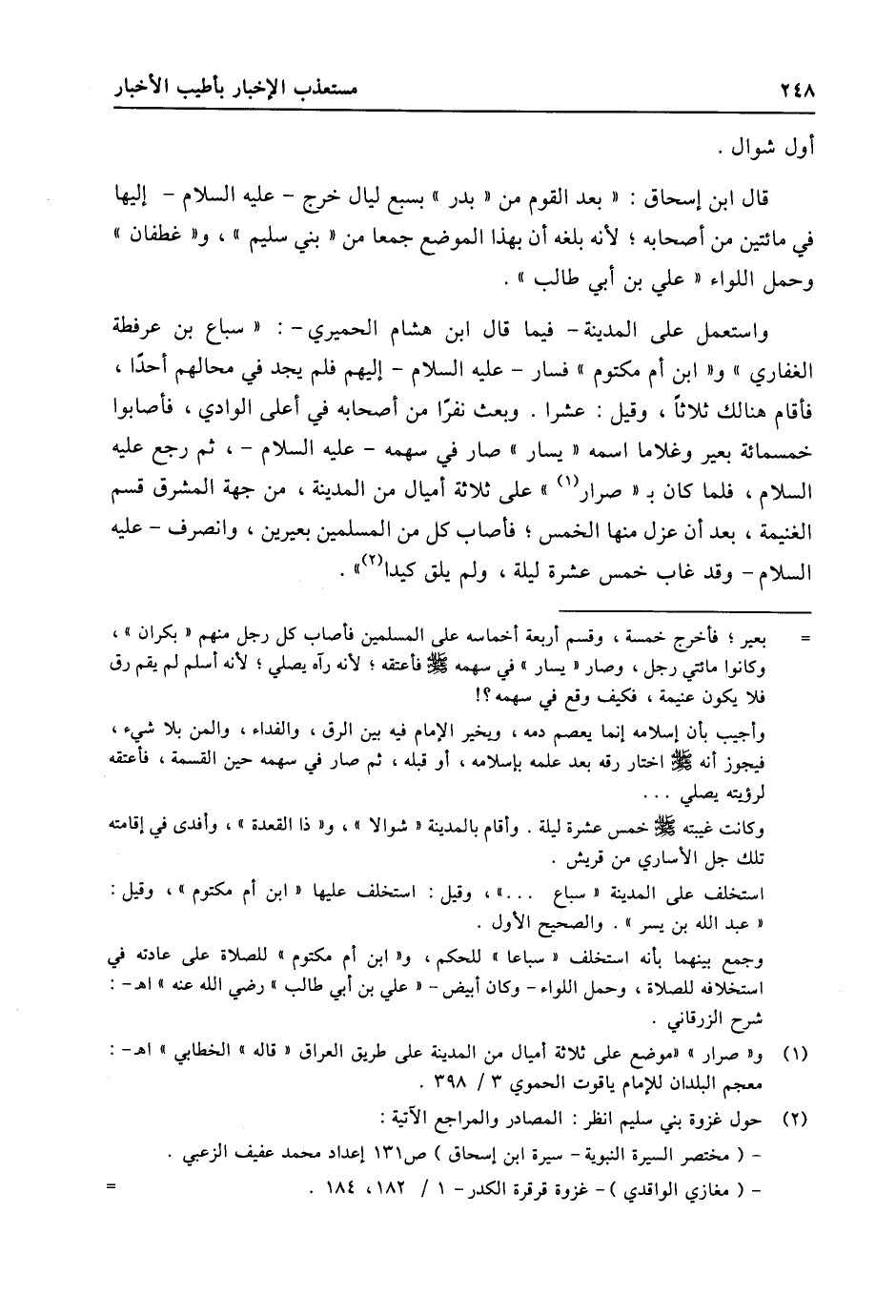 - بعير؛ فأخرج خمسة، وقسم أربعة أخماسه على المسلمين فأصاب كل رجل منهم «بكران» ، وكانوا مائتي رجل، وصار «يسار» في سهمه صلى الله عليه وسلّم فأعتقه؛ لأنه رآه يصلي؛ لأنه أسلم لم يقم رق فلا يكون عنيمة، فكيف وقع في سهمه؟! وأجيب بأن إسلامه إنما يعصم دمه، ويخير الإمام فيه بين الرق، والفداء، والمن بلا شيء، فيجوز أنه صلى الله عليه وسلّم اختار رقه بعد علمه بإسلامه، أو قبله، ثم صار في سهمه حين القسمة، فأعتقه لرؤيته يصلي ... وكانت غيبته صلى الله عليه وسلّم خمس عشرة ليلة. وأقام بالمدينة «شوالا» ، و «ذا القعدة» ، وأفدى في إقامته تلك جل الأساري من قريش. استخلف على المدينة «سباع ... » ، وقيل: استخلف عليها «ابن أم مكتوم» ، وقيل: «عبد الله بن يسر» . والصحيح الأول. وجمع بينهما بأنه استخلف «سباعا» للحكم، و «ابن أم مكتوم» للصلاة على عادته في استخلافه للصلاة، وحمل اللواء- وكان أبيض- «علي بن أبي طالب» رضي الله عنه» اه-: شرح الزرقاني.