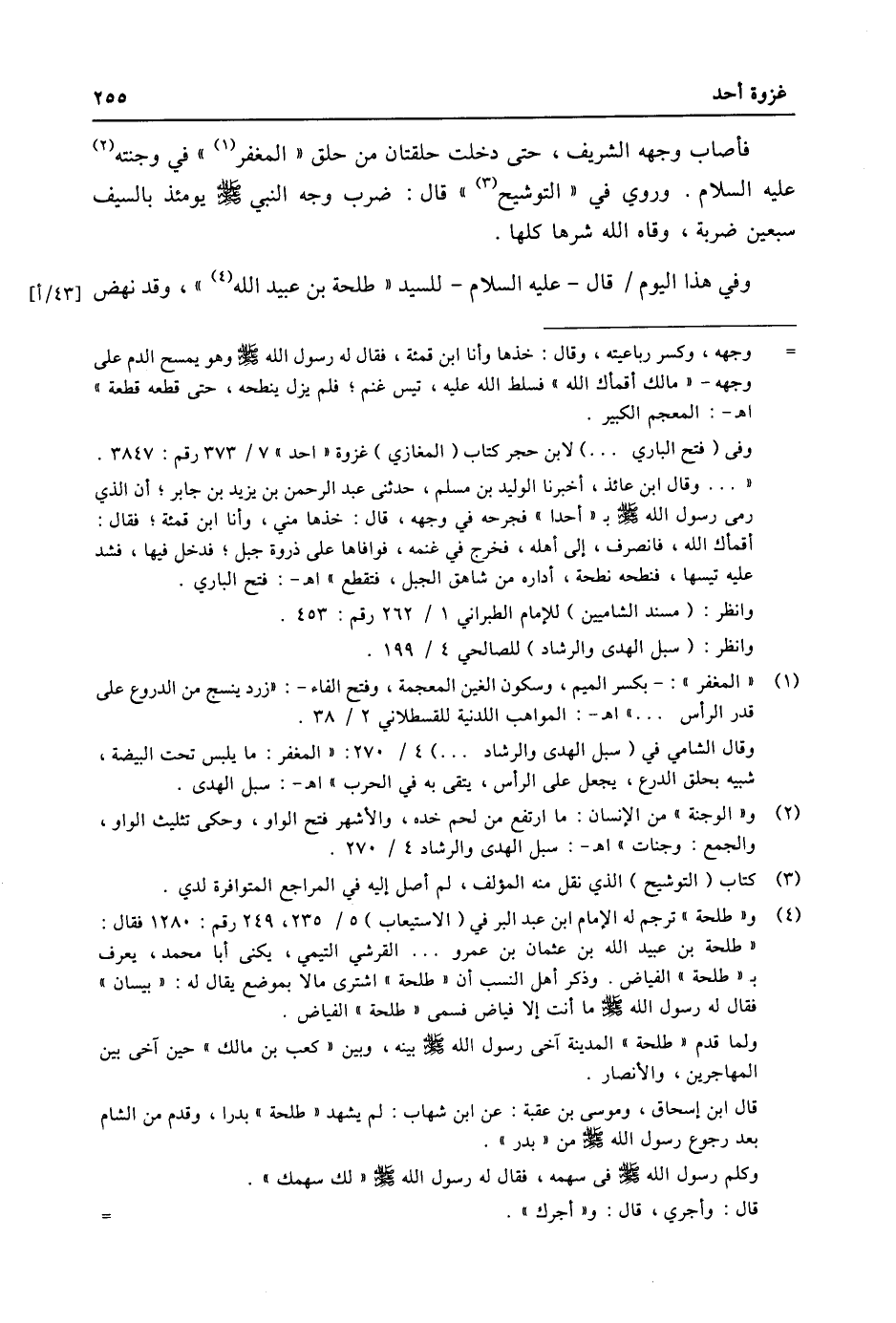 (1) «المغفر» : - بكسر الميم، وسكون الغين المعجمة، وفتح الفاء-: «زرد ينسج من الدروع على قدر الرأس ... » اه-: المواهب اللدنية للقسطلاني 2/ 38. وقال الشامي في (سبل الهدى والرشاد ... ) 4/ 270: «المغفر: ما يلبس تحت البيضة، شبيه بحلق الدرع، يجعل على الرأس، يتقى به في الحرب» اه-: سبل الهدى.