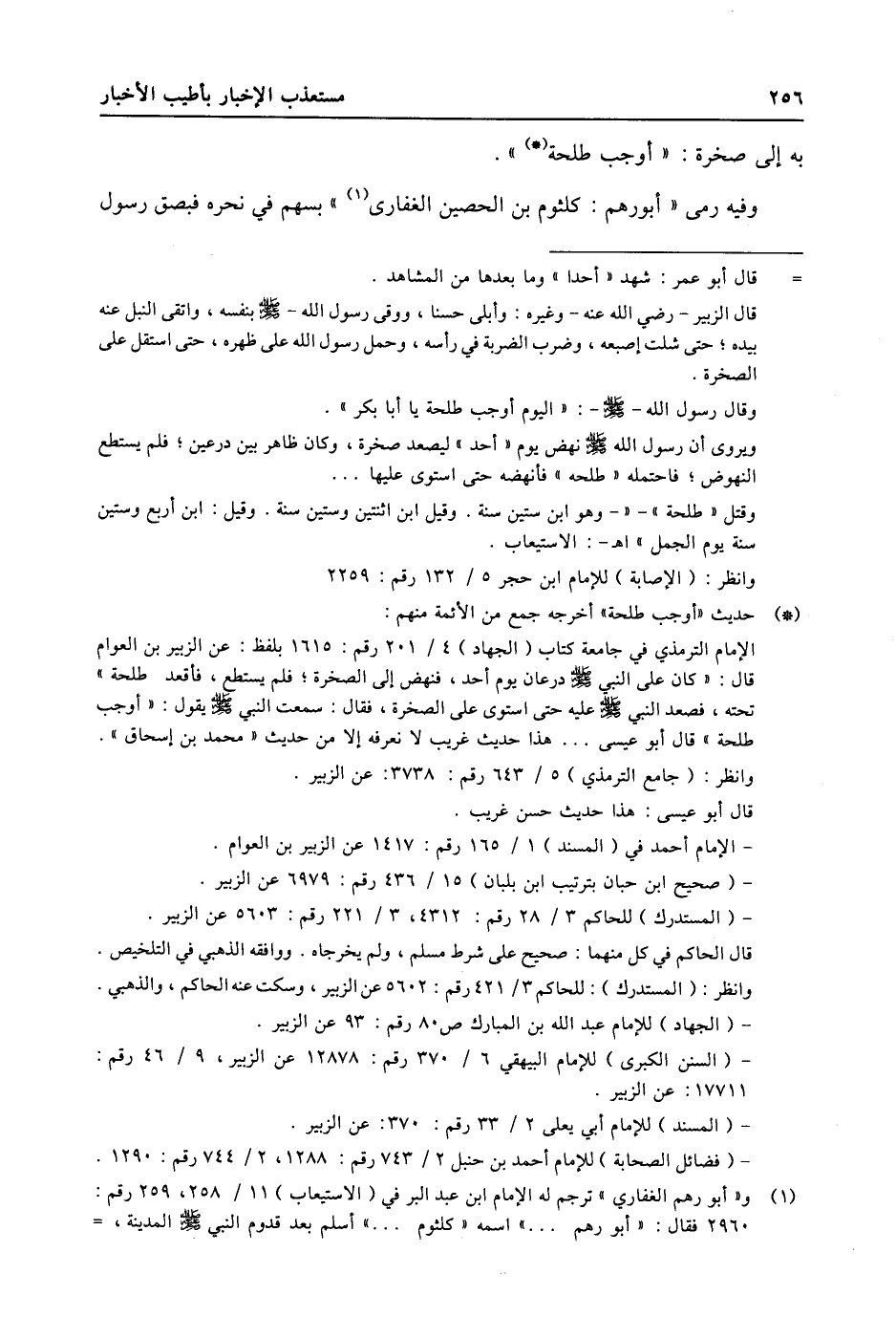 (*) حديث «أوجب طلحة» أخرجه جمع من الأئمة منهم: الإمام الترمذي في جامعة كتاب (الجهاد) 4/ 201 رقم: 1615 بلفظ: عن الزبير بن العوام قال: «كان على النبي صلى الله عليه وسلّم درعان يوم أحد، فنهض إلى الصخرة؛ فلم يستطع، فأقعد طلحة» تحته، فصعد النبي صلى الله عليه وسلّم عليه حتى استوى على الصخرة، فقال: سمعت النبي صلى الله عليه وسلّم يقول: «أوجب طلحة» قال أبو عيسى ... هذا حديث غريب لا نعرفه إلا من حديث «محمد بن إسحاق» . وانظر: (جامع الترمذي) 5/ 643 رقم: 3738: عن الزبير. قال أبو عيسى: هذا حديث حسن غريب. - الإمام أحمد في (المسند) 1/ 165 رقم: 1417 عن الزبير بن العوام. - (صحيح ابن حبان بترتيب ابن بلبان) 15/ 436 رقم: 6979 عن الزبير. - (المستدرك) للحاكم 3/ 28 رقم: 4312، 3/ 221 رقم: 5603 عن الزبير. قال الحاكم في كل منهما: صحيح على شرط مسلم، ولم يخرجاه. ووافقه الذهبي في التلخيص. وانظر: (المستدرك) : للحاكم 3/ 421 رقم: 5602 عن الزبير، وسكت عنه الحاكم، والذهبي. - (الجهاد) للإمام عبد الله بن المبارك ص 80 رقم: 93 عن الزبير. - (السنن الكبرى) للإمام البيهقي 6/ 370 رقم: 12878 عن الزبير، 9/ 46 رقم: 17711: عن الزبير. - (المسند) للإمام أبي يعلى 2/ 33 رقم: 370: عن الزبير. - (فضائل الصحابة) للإمام أحمد بن حنبل 2/ 743 رقم: 1288، 2/ 744 رقم: 1290.