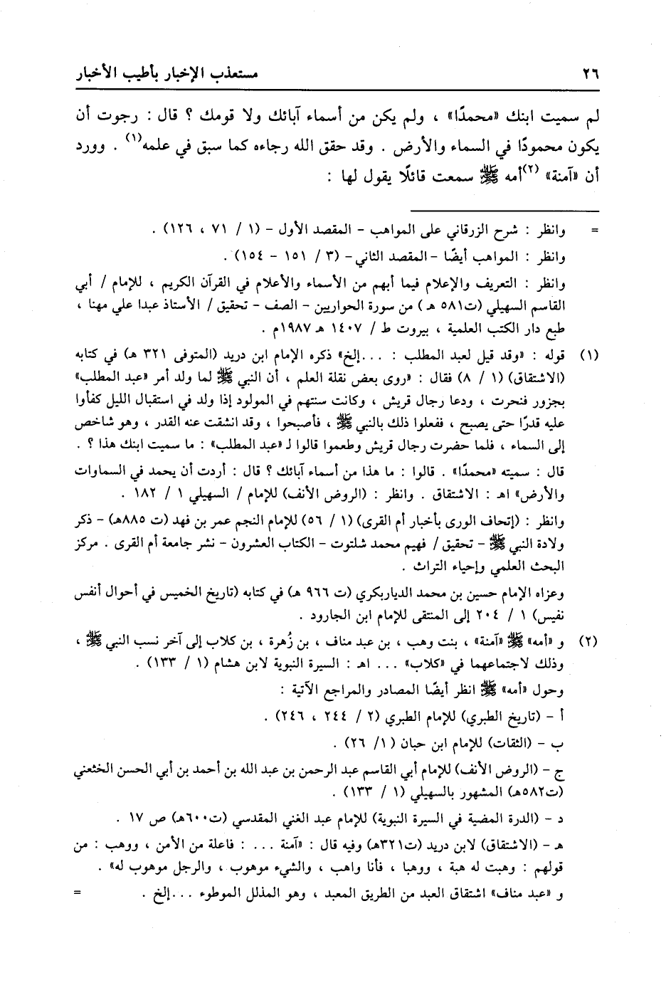 (1) قوله: «وقد قيل لعبد المطلب: ... إلخ» ذكره الإمام ابن دريد (المتوفى 321 هـ) في كتابه (الاشتقاق) (1/ 8) فقال: «روى بعض نقلة العلم، أن النبي صلى الله عليه وسلّم لما ولد أمر «عبد المطلب» بجزور فنحرت، ودعا رجال قريش، وكانت سنتهم في المولود إذا ولد في استقبال الليل كفأوا عليه قدرا حتى يصبح، ففعلوا ذلك بالنبي صلى الله عليه وسلّم، فأصبحوا، وقد انشقت عنه القدر، وهو شاخص إلى السماء، فلما حضرت رجال قريش وطعموا قالوا ل «عبد المطلب» : ما سميت ابنك هذا؟. قال: سميته «محمدا» . قالوا: ما هذا من أسماء آبائك؟ قال: أردت أن يحمد في السماوات والأرض» اه: الاشتقاق. وانظر: (الروض الأنف) للإمام/ السهيلي 1/ 182. وانظر: (إتحاف الورى بأخبار أم القرى) (1/ 56) للإمام النجم عمر بن فهد (ت 885 هـ) - ذكر ولادة النبي صلى الله عليه وسلّم- تحقيق/ فهيم محمد شلتوت- الكتاب العشرون- نشر جامعة أم القرى. مركز البحث العلمي وإحياء التراث. وعزاه الإمام حسين بن محمد الديار بكري (ت 966 هـ) في كتابه (تاريخ الخميس في أحوال أنفس نفيس) 1/ 204 إلى المنتقى للإمام ابن الجارود.