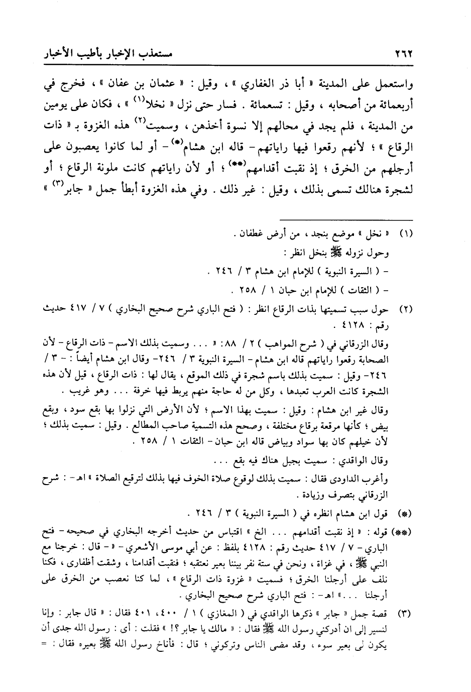 (2) حول سبب تسميتها بذات الرقاع انظر: (فتح الباري شرح صحيح البخاري) 7/ 417 حديث رقم: 4128. وقال الزرقاني في (شرح المواهب) 2/ 88: « ... وسميت بذلك الاسم- ذات الرقاع- لأن الصحابة رقعوا راياتهم قاله ابن هشام- السيرة النبوية 3/ 246- وقال ابن هشام أيضا: - 3/ 246- وقيل: سميت بذلك باسم شجرة في ذلك الموقع، يقال لها: ذات الرقاع، قيل لأن هذه الشجرة كانت العرب تعبدها، وكل من له حاجة منهم يربط فيها خرقة ... وهو غريب. وقال غير ابن هشام: وقيل: سميت بهذا الاسم؛ لأن الأرض التي نزلوا بها بقع سود، وبقع بيض؛ كأنها مرقعة برقاع مختلفة، وصحح هذه التسمية صاحب المطالع. وقيل: سميت بذلك؛ لأن خيلهم كان بها سواد وبياض قاله ابن حبان- الثقات 1/ 258. وقال الواقدي: سميت بجبل هناك فيه بقع ... وأغرب الداودى فقال: سميت بذلك لوقوع صلاة الخوف فيها بذلك لترقيع الصلاة» اه-: شرح الزرقاني بتصرف وزيادة.