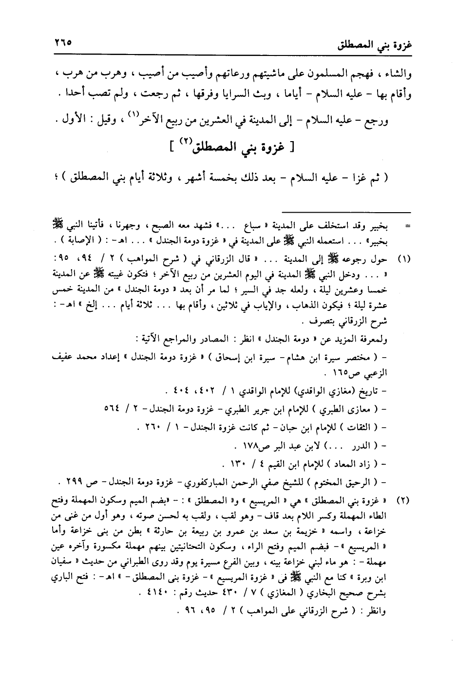 (2) «غزوة بني المصطلق» هي «المريسيع» و «المصطلق» : - «بضم الميم وسكون المهملة وفتح الطاء المهملة وكسر اللام بعد قاف- وهو لقب، ولقب به لحسن صوته، وهو أول من غنى من خزاعة، واسمه «خزيمة بن سعد بن عمرو بن ربيعة بن حارثة» بطن من بنى خزاعة وأما «المريسيع» - فبضم الميم وفتح الراء، وسكون التحتانيتين بينهم مهملة مكسورة وآخره عين مهملة-: هو ماء لبني خزاعة بينه، وبين الفرع مسيرة يوم وقد روى الطبراني من حديث «سفيان ابن وبرة» كنا مع النبي صلى الله عليه وسلّم فى «غزوة المريسيع» - غزوة بنى المصطلق-» اه-: فتح الباري بشرح صحيح البخاري (المغازي) 7/ 430 حديث رقم: 4140. وانظر: (شرح الزرقاني على المواهب) 2/ 95، 96.