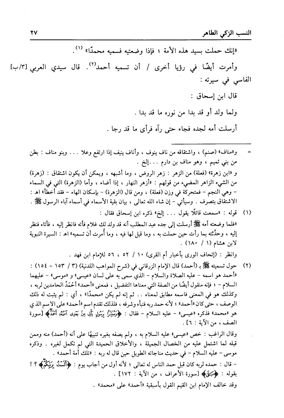 وأمرت أيضا في رؤيا أخرى/ أن تسميه أحمد «2» . قال سيدي العربي الفاسي في سيرته: