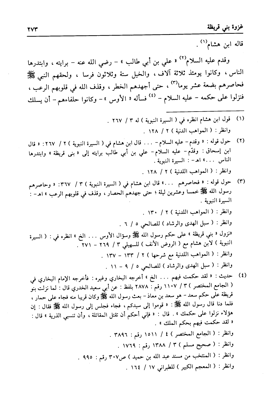 (3) حول قوله: «فحاصرهم ... » قال ابن هشام في (السيرة النبوية) 3/ 367: «وحاصرهم رسول الله صلى الله عليه وسلّم خمسا وعشرين ليلة؛ حتى جهدهم الحصار، وقذف في قلوبهم الرعب» اه-: السيرة النبوية. وانظر: (المواهب اللدنية) 2/ 130. وانظر: (سبل الهدى والرشاد) للصالحي 5/ 6. «نزول «بني قريظة» على حكم رسول الله صلى الله عليه وسلّم وسؤال الأوس ... الخ» انظره في: (السيرة النبوية) لابن هشام مع (الروض الأنف) للسهيلي 3/ 269- 271. وانظر: (المواهب اللدنية مع شرحها) 2/ 133- 137. وانظر: (سبل الهدى والرشاد) للصالحي 5/ 9- 11.