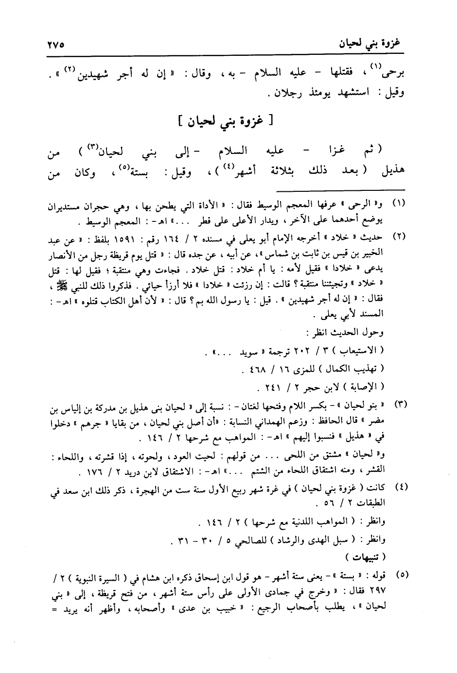 (4) كانت (غزوة بني لحيان) في غرة شهر ربيع الأول سنة ست من الهجرة، ذكر ذلك ابن سعد في الطبقات 2/ 56. وانظر: (المواهب اللدنية مع شرحها) 2/ 146. وانظر: (سبل الهدى والرشاد) للصالحي 5/ 30- 31. (تنبيهات)