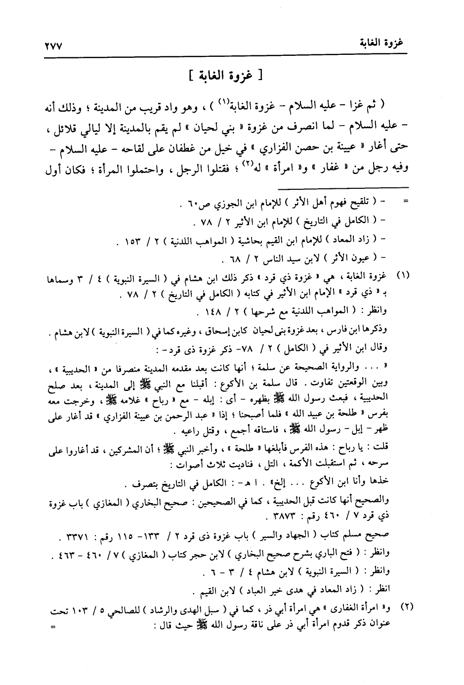 (1) غزوة الغابة، هي «غزوة ذي قرد» ذكر ذلك ابن هشام في (السيرة النبوية) 4/ 3 وسماها ب «ذي قرد» الإمام ابن الأثير في كتابه (الكامل في التاريخ) 2/ 78. وانظر: (المواهب اللدنية مع شرحها) 2/ 148. وذكرها ابن فارس، بعد غزوة بني لحيان كابن إسحاق، وغيره كما في (السيرة النبوية) لابن هشام. وقال ابن الأثير في (الكامل) 2/ 78- ذكر غزوة ذى قرد-: « ... والرواية الصحيحة عن سلمة؛ أنها كانت بعد مقدمه المدينة منصرفا من «الحديبية» ، وبين الوقعتين تفاوت. قال سلمة بن الأكوع: أقبلنا مع النبي صلى الله عليه وسلّم إلى المدينة، بعد صلح الحديبية، فبعث رسول الله صلى الله عليه وسلّم بظهره- أي: إبله- مع «رباح» غلامه صلى الله عليه وسلّم، وخرجت معه بفرس «طلحة بن عبيد الله» فلما أصبحنا؛ إذا «عبد الرحمن بن عيينة الفزاري» قد أغار على ظهر- إبل- رسول الله صلى الله عليه وسلّم، فاستاقه أجمع، وقتل راعيه. قلت: يا رباح: هذه الفرس فأبلغها «طلحة» ، وأخبر النبي صلى الله عليه وسلّم؛ أن المشركين، قد أغاروا على سرحه، ثم استقبلت الأكمة، التل، فناديت ثلاث أصوات: خذها وأنا ابن الأكوع ... إلخ» . اه-: الكامل في التاريخ بتصرف. والصحيح أنها كانت قبل الحديبية، كما في الصحيحين: صحيح البخاري (المغازي) باب غزوة ذي قرد 7/ 460 رقم: 3873. صحيح مسلم كتاب (الجهاد والسير) باب غزوة ذى قرد 2/ 133- 115 رقم: 3371. وانظر: (فتح الباري بشرح صحيح البخاري) لابن حجر كتاب (المغازي) 7/ 460- 463. وانظر: (السيرة النبوية) لابن هشام 4/ 3- 6. انظر: (زاد المعاد في هدى خير العباد) لابن القيم.