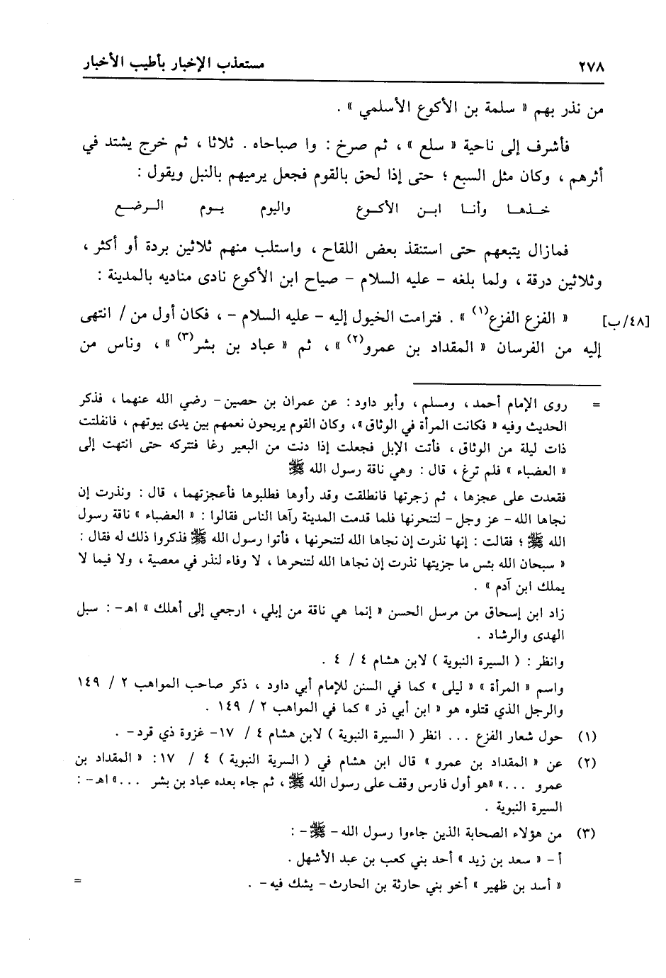 - روى الإمام أحمد، ومسلم، وأبو داود: عن عمران بن حصين- رضي الله عنهما، فذكر الحديث وفيه «فكانت المرأة في الوثاق» ، وكان القوم يريحون نعمهم بين يدى بيوتهم، فانفلتت ذات ليلة من الوثاق، فأتت الإبل فجعلت إذا دنت من البعير رغا فتتركه حتى انتهت إلى «العضباء» فلم ترغ، قال: وهي ناقة رسول الله صلى الله عليه وسلّم. فقعدت على عجزها، ثم زجرتها فانطلقت وقد رأوها فطلبوها فأعجزتهما، قال: ونذرت إن نجاها الله- عز وجل- لتنحرنها فلما قدمت المدينة رآها الناس فقالوا: «العضباء» ناقة رسول الله صلى الله عليه وسلّم؛ فقالت: إنها نذرت إن نجاها الله لتنحرنها، فأتوا رسول الله صلى الله عليه وسلّم فذكروا ذلك له فقال: «سبحان الله بئس ما جزيتها نذرت إن نجاها الله لتنحرها، لا وفاء لنذر في معصية، ولا فيما لا يملك ابن آدم» . زاد ابن إسحاق من مرسل الحسن «إنما هي ناقة من إبلي، ارجعي إلى أهلك» اه-: سبل الهدى والرشاد. وانظر: (السيرة النبوية) لابن هشام 4/ 4. واسم «المرأة» «ليلى» كما في السنن للإمام أبي داود، ذكر صاحب المواهب 2/ 149 والرجل الذي قتلوه هو «ابن أبي ذر» كما في المواهب 2/ 149.