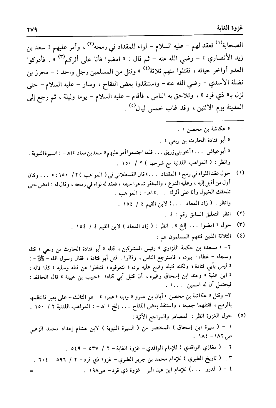 (5) حول الغزوة انظر: المصادر والمراجع الاتية: 1- (سيرة ابن إسحاق) المختصر من (السيرة النبوية) لابن هشام إعداد محمد الزعبي ص 182- 184. 2- (مغازي الواقدي) للإمام الواقدي- غزوة الغابة- 2/ 537- 549. 3- (تاريخ الطبري) للإمام محمد بن جرير الطبري- غزوة ذي قرد- 2/ 596- 604. 4- (الدرر ... ) للإمام ابن عبد البر- غزوة ذي قرد- ص 198.