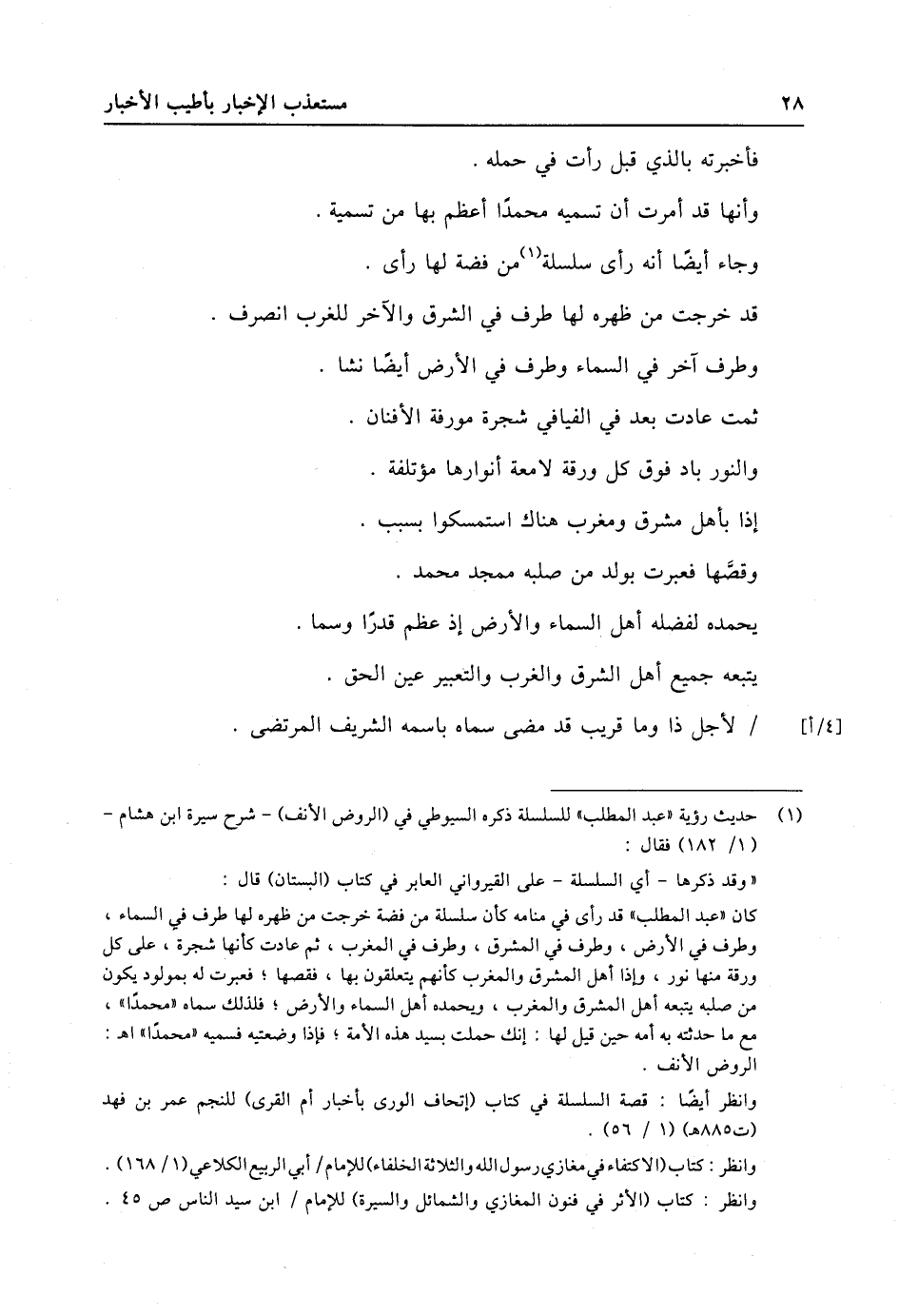 (1) حديث رؤية «عبد المطلب» للسلسلة ذكره السيوطي في (الروض الأنف) - شرح سيرة ابن هشام- (1/ 182) فقال: «وقد ذكرها- أي السلسلة- على القيرواني العابر في كتاب (البستان) قال: كان «عبد المطلب» قد رأى في منامه كأن سلسلة من فضة خرجت من ظهره لها طرف في السماء، وطرف في الأرض، وطرف في المشرق، وطرف في المغرب، ثم عادت كأنها شجرة، على كل ورقة منها نور، وإذا أهل المشرق والمغرب كأنهم يتعلقون بها، فقصها؛ فعبرت له بمولود يكون من صلبه يتبعه أهل المشرق والمغرب، ويحمده أهل السماء والأرض؛ فلذلك سماه «محمدا» ، مع ما حدثته به أمه حين قيل لها: إنك حملت بسيد هذه الأمة؛ فإذا وضعتيه فسميه «محمدا» اه: الروض الأنف. وانظر أيضا: قصة السلسلة في كتاب (إتحاف الورى بأخبار أم القرى) للنجم عمر بن فهد (ت 885 هـ) (1/ 56) . وانظر: كتاب (الاكتفاء في مغازي رسول الله والثلاثة الخلفاء) للإمام/ أبي الربيع الكلاعي (1/ 168) . وانظر: كتاب (الأثر في فنون المغازي والشمائل والسيرة) للإمام/ ابن سيد الناس ص 45.
