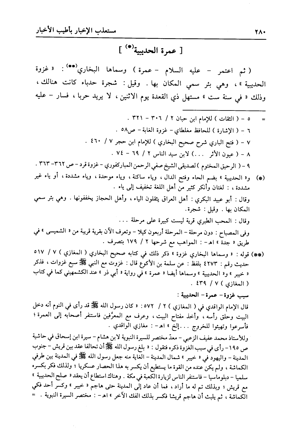 (**) قوله: «وسماها البخاري غزوة» ذكر ذلك في كتابه صحيح البخاري (المغازي) 7/ 517 حديث رقم: 4273 بلفظ: عن سلمة بن الأكوع قال: غزوت مع النبي صلى الله عليه وسلّم سبع غزوات، فذكر «خيبر» و «الحديبية» وسماها أيضا «عمرة» في رواية «أبي ذر» عند الكشمهيني كما في كتاب (المغازي) 7/ 439. سبب غزوة- عمرة- الحديبية: قال الإمام الواقدي في (المغازي) 2/ 572: «كان رسول الله صلى الله عليه وسلّم قد رأى في النوم أنه دخل البيت وحلق رأسه، وأخذ مفتاح البيت، وعرف مع المعرّفين فاستنفر أصحابه إلى العمرة؛ فأسرعوا وتهيئوا للخروج ... إلخ» اه-: مغازي الواقدي. وللأستاذ محمد عفيف الزعبي- معدّ مختصر للسيرة النبوية لابن هشام- سيرة ابن إسحاق في حاشية ص 195- رأى في سبب الغزوة ذكره فتقول: «بلغ رسول الله صلى الله عليه وسلّم أن تحالفا عقد بين قريش- جنوب المدينة- واليهود في «خيبر» شمال المدينة- الغاية منه جعل رسول الله صلى الله عليه وسلّم في المدينة بين طرفي الكماشة، ولم يكن عنده من القوة ما يستطيع أن يكسر به هذا الحصار عسكريا؛ ولذلك فكر بكسره سلميا- دبلوماسيا- فاستنفر الناس لزيارة الكعبة في مكة. وهناك استطاع أن يعقد «صلح الحديبية» مع قريش؛ وبذلك تم له ما أراد، فما أن عاد إلى المدينة حتى هاجم «خيبر» وكسر أحد فكي الكماشة، ثم يلبث أن هاجم قريشا فكسر بذلك الفلك الاخر» اه-: مختصر السيرة النبوية. -
