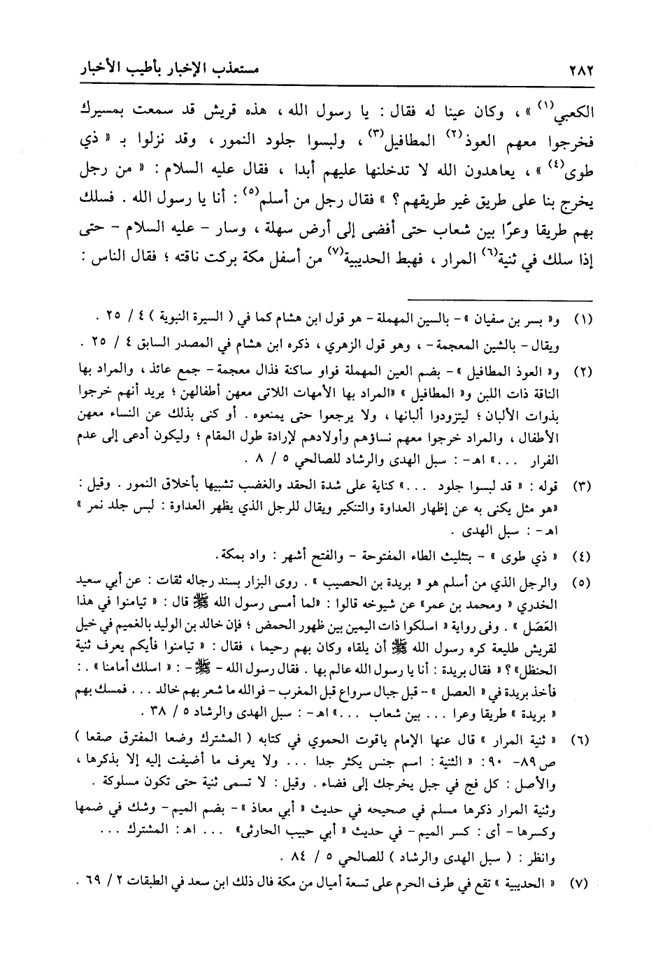 (5) والرجل الذي من أسلم هو «بريدة بن الحصيب» . روى البزار بسند رجاله ثقات: عن أبي سعيد الخدري «ومحمد بن عمر» عن شيوخه قالوا: «لما أمسى رسول الله صلى الله عليه وسلّم قال: «تيامنوا في هذا العصل» . وفى رواية «اسلكوا ذات اليمين بين ظهور الحمض؛ فإن خالد بن الوليد بالغميم في خيل لقريش طليعة كره رسول الله صلى الله عليه وسلّم أن يلقاه وكان بهم رحيما، فقال: «تيامنوا فأيكم يعرف ثنية الحنظل» ؟ «فقال بريدة: أنا يا رسول الله عالم بها. فقال رسول الله- صلى الله عليه وسلّم-: «اسلك أمامنا» .: فأخذ بريدة في «العصل» - قبل جبال سرواع قبل المغرب- فو الله ما شعر بهم خالد ... فمسك بهم «بريدة» طريقا وعرا ... بين شعاب ... » اه-: سبل الهدى والرشاد 5/ 38.