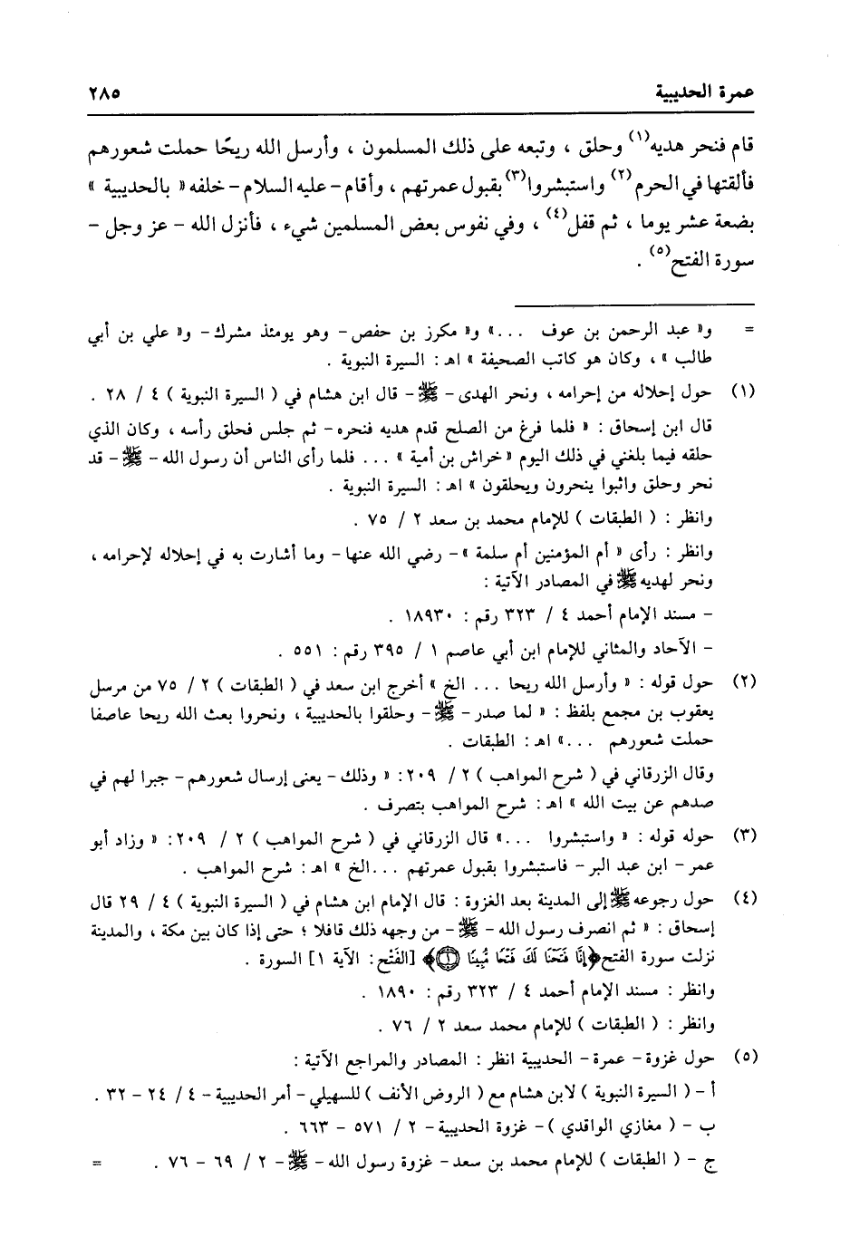 (5) حول غزوة- عمرة- الحديبية انظر: المصادر والمراجع الاتية: أ- (السيرة النبوية) لابن هشام مع (الروض الأنف) للسهيلي- أمر الحديبية- 4/ 24- 32. ب- (مغازي الواقدي) - غزوة الحديبية- 2/ 571- 663. ج- (الطبقات) للإمام محمد بن سعد- غزوة رسول الله- صلى الله عليه وسلّم- 2/ 69- 76.