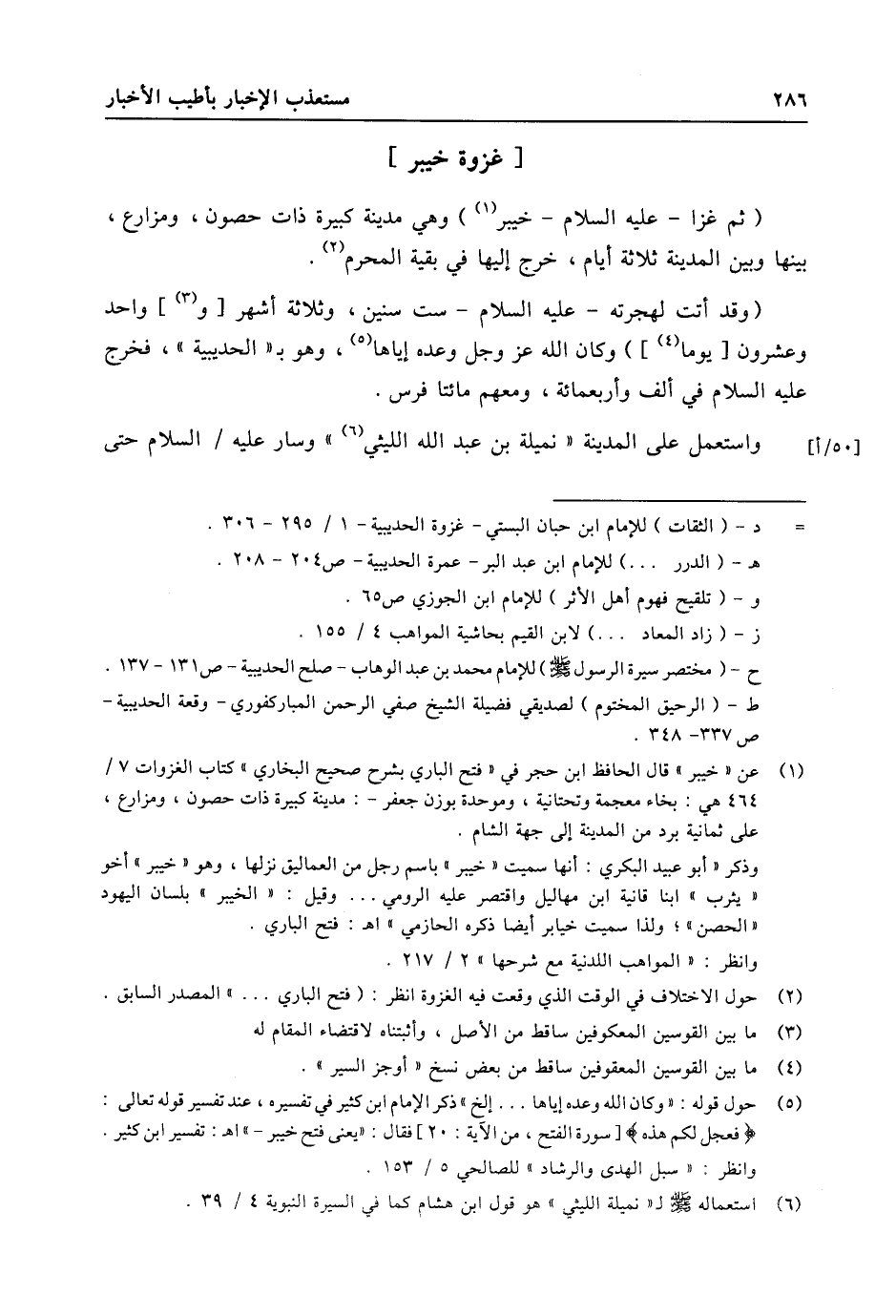 (1) عن «خيبر» قال الحافظ ابن حجر في «فتح الباري بشرح صحيح البخاري» كتاب الغزوات 7/ 464 هي: بخاء معجمة وتحتانية، وموحدة بوزن جعفر-: مدينة كبيرة ذات حصون، ومزارع، على ثمانية برد من المدينة إلى جهة الشام. وذكر «أبو عبيد البكري: أنها سميت «خيبر» باسم رجل من العماليق نزلها، وهو «خيبر» أخو «يثرب» ابنا قانية ابن مهاليل واقتصر عليه الرومي ... وقيل: «الخيبر» بلسان اليهود «الحصن» ؛ ولذا سميت خيابر أيضا ذكره الحازمي» اه: فتح الباري. وانظر: «المواهب اللدنية مع شرحها» 2/ 217.
