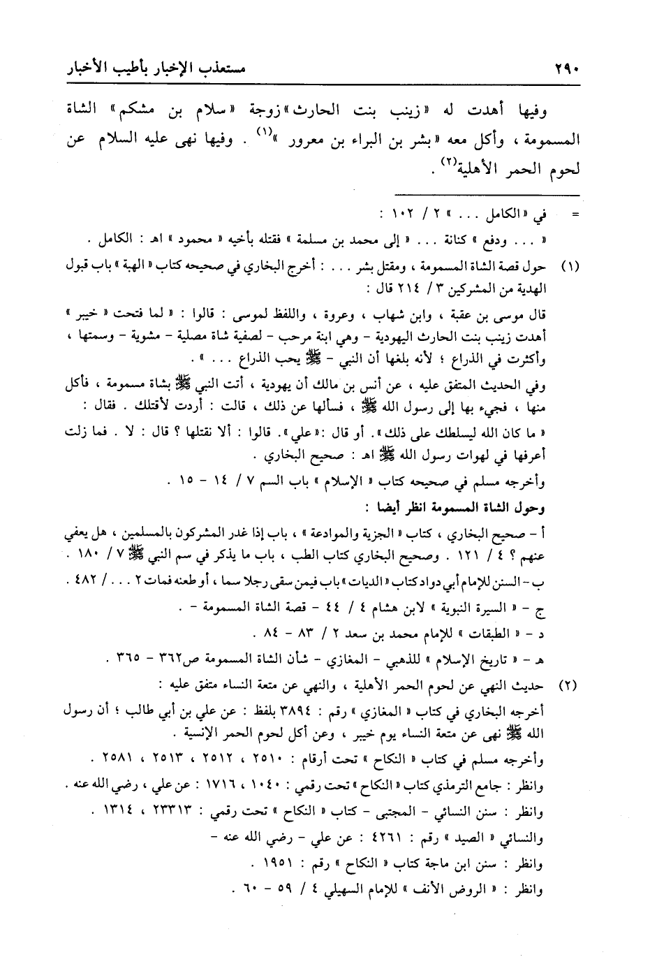(1) حول قصة الشاة المسمومة، ومقتل بشر ... : أخرج البخاري في صحيحه كتاب «الهبة» باب قبول الهدية من المشركين 3/ 214 قال: قال موسى بن عقبة، وابن شهاب، وعروة، واللفظ لموسى: قالوا: «لما فتحت «خيبر» أهدت زينب بنت الحارث اليهودية- وهي ابنة مرحب- لصفية شاة مصلية- مشوية- وسمتها، وأكثرت في الذراع؛ لأنه بلغها أن النبي- صلى الله عليه وسلّم يحب الذراع ... » . وفي الحديث المتفق عليه، عن أنس بن مالك أن يهودية، أتت النبي صلى الله عليه وسلّم بشاة مسمومة، فأكل منها، فجيء بها إلى رسول الله صلى الله عليه وسلّم، فسألها عن ذلك، قالت: أردت لأقتلك. فقال: «ما كان الله ليسلطك على ذلك» . أو قال: «علي» . قالوا: ألا نقتلها؟ قال: لا. فما زلت أعرفها في لهوات رسول الله صلى الله عليه وسلّم اه: صحيح البخاري. وأخرجه مسلم في صحيحه كتاب «الإسلام» باب السم 7/ 14- 15. وحول الشاة المسمومة انظر أيضا: أ- صحيح البخاري، كتاب «الجزية والموادعة» ، باب إذا غدر المشركون بالمسلمين، هل يعفي عنهم؟ 4/ 121. وصحيح البخاري كتاب الطب، باب ما يذكر في سم النبي صلى الله عليه وسلّم 7/ 180. ب- السنن للإمام أبي داود كتاب «الديات» باب فيمن سقى رجلا سما، أو طعنه فمات 2 ... / 482. ج- «السيرة النبوية» لابن هشام 4/ 44- قصة الشاة المسمومة-. د- «الطبقات» للإمام محمد بن سعد 2/ 83- 84. هـ- «تاريخ الإسلام» للذهبي- المغازي- شأن الشاة المسمومة ص 362- 365.