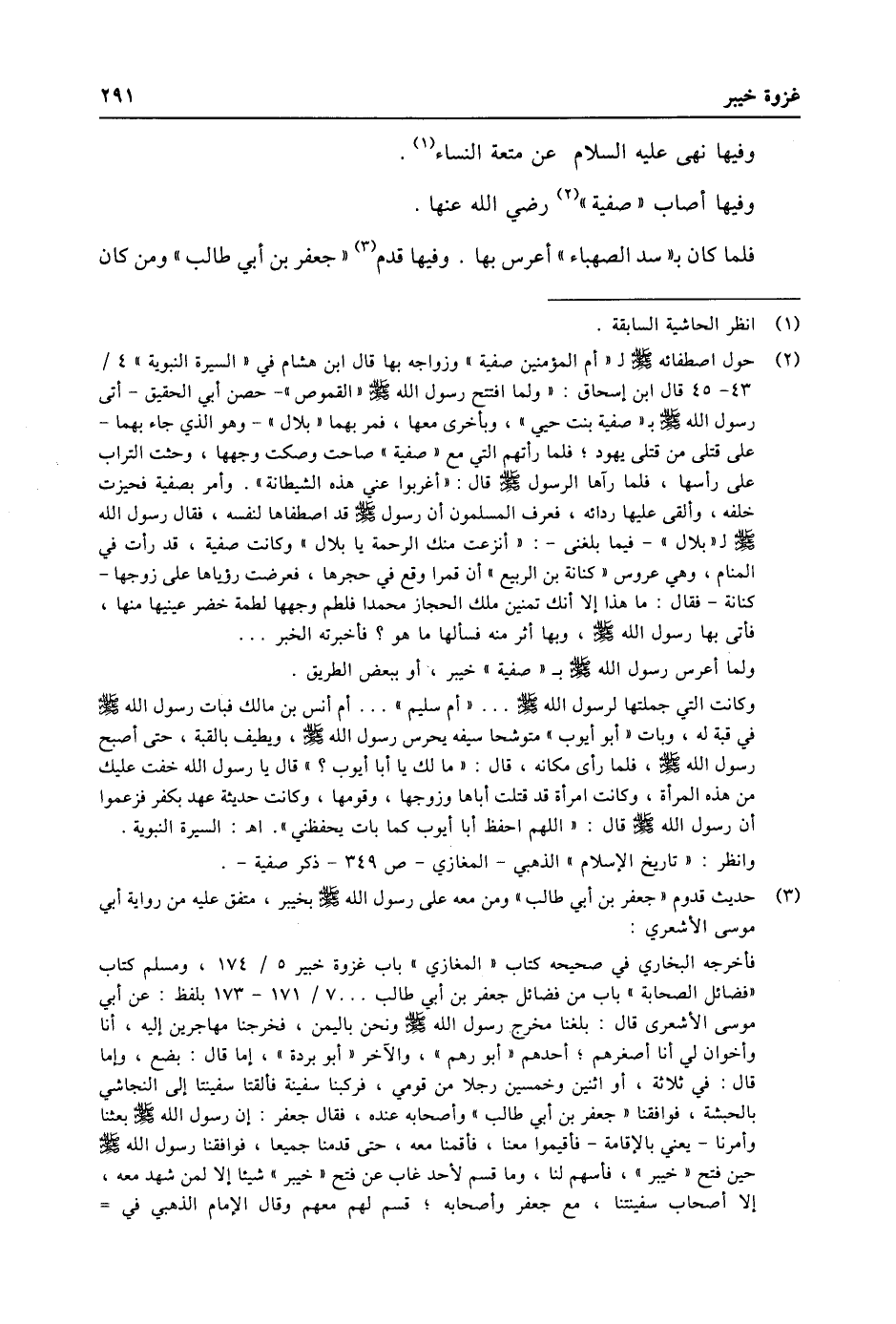 (2) حول اصطفائه صلى الله عليه وسلّم ل «أم المؤمنين صفية» وزواجه بها قال ابن هشام في «السيرة النبوية» 4/ 43- 45 قال ابن إسحاق: «ولما افتتح رسول الله صلى الله عليه وسلّم «القموص» - حصن أبي الحقيق- أتى رسول الله صلى الله عليه وسلّم ب «صفية بنت حيي» ، وبأخرى معها، فمر بهما «بلال» - وهو الذي جاء بهما- على قتلى من قتلى يهود؛ فلما رأتهم التي مع «صفية» صاحت وصكت وجهها، وحثت التراب على رأسها، فلما رآها الرسول صلى الله عليه وسلّم قال: «أغربوا عني هذه الشيطانة» . وأمر بصفية فحيزت خلفه، وألقى عليها ردائه، فعرف المسلمون أن رسول الله صلى الله عليه وسلّم قد اصطفاها لنفسه، فقال رسول الله صلى الله عليه وسلّم ل «بلال» - فيما بلغني-: «أنزعت منك الرحمة يا بلال» وكانت صفية، قد رأت في المنام، وهي عروس «كنانة بن الربيع» أن قمرا وقع في حجرها، فعرضت رؤياها على زوجها- كنانة- فقال: ما هذا إلا أنك تمنين ملك الحجاز محمدا فلطم وجهها لطمة خضر عينيها منها، فأتى بها رسول الله صلى الله عليه وسلّم، وبها أثر منه فسألها ما هو؟ فأخبرته الخبر ... ولما أعرس رسول الله صلى الله عليه وسلّم ب «صفية» خيبر، أو ببعض الطريق. وكانت التي جملتها لرسول الله صلى الله عليه وسلّم ... «أم سليم» ... أم أنس بن مالك فبات رسول الله صلى الله عليه وسلّم في قبة له، وبات «أبو أيوب» متوشحا سيفه يحرس رسول الله صلى الله عليه وسلّم، ويطيف بالقبة، حتى أصبح رسول الله صلى الله عليه وسلّم، فلما رأى مكانه، قال: «ما لك يا أبا أيوب؟» قال يا رسول الله خفت عليك من هذه المرأة، وكانت امرأة قد قتلت أباها وزوجها، وقومها، وكانت حديثة عهد بكفر فزعموا أن رسول الله صلى الله عليه وسلّم قال: «اللهم احفظ أبا أيوب كما بات يحفظني» . اه: السيرة النبوية. وانظر: «تاريخ الإسلام» الذهبي- المغازي- ص 349- ذكر صفية-.