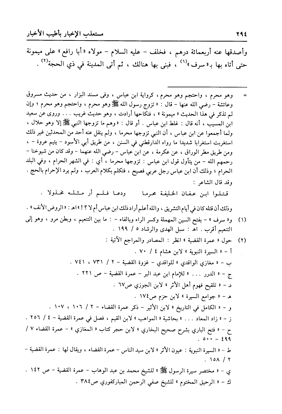 (2) حول «عمرة القضية» انظر: المصادر والمراجع الاتية: أ- «السيرة النبوية» لابن هشام 4/ 70. ب- «مغازي الواقدي» للواقدي- غزوة القضية- 2/ 731، 741. ج- «الدرر ... » للإمام ابن عبد البر- عمرة القضية- ص 221. د- «تلقيح فهوم أهل الأثر» لابن الجوزي ص 67. هـ- «جوامع السيرة» لابن حزم ص 174. و «الكامل في التاريخ» لابن الأثير- ذكر عمرة القضاء- 2/ 106، 107. ز- «زاد المعاد ... » بحاشية «المواهب» لابن القيم، فصل في عمرة القضية- 4/ 256. ح- «فتح الباري بشرح صحيح البخاري» لابن حجر كتاب «المغازي» - عمرة القضاء 7/ 499- 500. ط- «السيرة النبوية: عيون الأثر» لابن سيد الناس- عمرة القضاء، ويقال لها: عمرة القضية- 2/ 158. ي- «مختصر سيرة الرسول صلى الله عليه وسلّم» للشيخ محمد بن عبد الوهاب- عمرة القضية- ص 142. ك- «الرحيق المختوم» للشيخ صفي الرحمن المباركفوري ص 384.