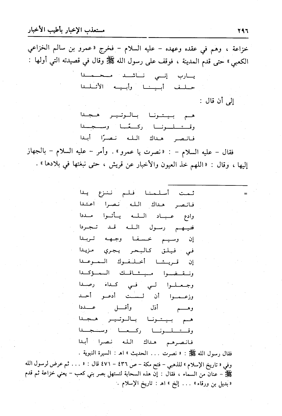 خزاعة، وهم في عقده وعهده- عليه السلام- فخرج «عمرو بن سالم الخزاعي الكعبي» حتى قدم المدينة، فوقف على رسول الله صلى الله عليه وسلّم وقال في قصيدته التي أولها: