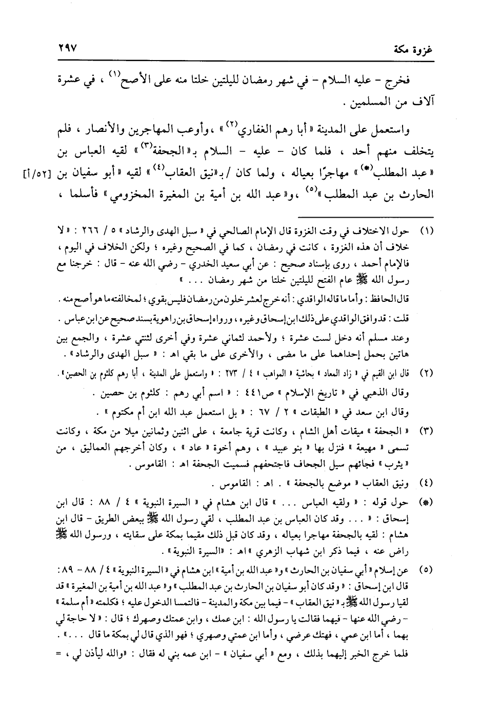 (*) حول قوله: «ولقيه العباس ... » قال ابن هشام في «السيرة النبوية» 4/ 88: قال ابن إسحاق: « ... وقد كان العباس بن عبد المطلب، لقي رسول الله صلى الله عليه وسلّم ببعض الطريق- قال ابن هشام: لقيه بالجحفة مهاجرا بعياله، وقد كان قبل ذلك مقيما بمكة على سقايته، ورسول الله صلى الله عليه وسلّم راض عنه، فيما ذكر ابن شهاب الزهري» اه: «السيرة النبوية» .