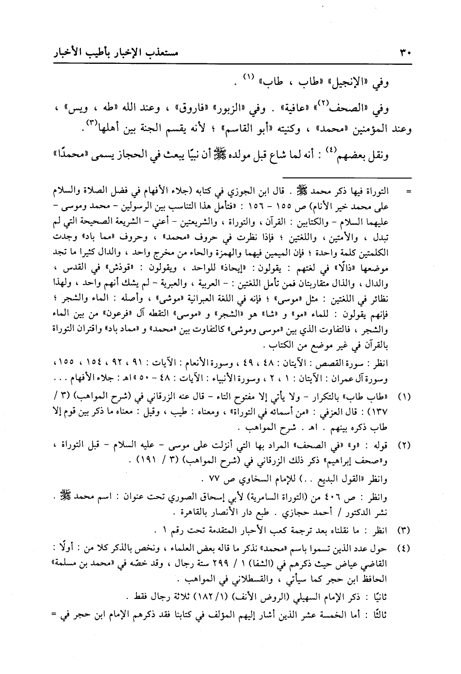 - التوراة فيها ذكر محمد صلى الله عليه وسلّم. قال ابن الجوزي في كتابه (جلاء الأفهام في فضل الصلاة والسلام على محمد خير الأنام) ص 155- 156: «فتأمل هذا التناسب بين الرسولين- محمد وموسى- عليهما السلام- والكتابين: القرآن، والتوراة، والشريعتين- أعني- الشريعة الصحيحة التي لم تبدل، والأمتين، واللغتين؛ فإذا نظرت في حروف «محمد» ، وحروف «مما باد» وجدت الكلمتين كلمة واحدة؛ فإن الميمين فيهما والهمزة والحاء من مخرج واحد، والدال كثيرا ما تجد موضعها «ذالا» في لغتهم: يقولون: «إيحاذ» للواحد، ويقولون: «قوذش» في القدس، والدال، والذال متقاربتان فمن تأمل اللغتين: - العربية، والعبرية- لم يشك أنهم واحد، ولهذا نظائر في اللغتين: مثل «موسى» ؛ فإنه في اللغة العبرانية «موشى» ، وأصله: الماء والشجر؛ فإنهم يقولون: للماء «مو» و «شا» هو «الشجر» و «موسى» التقطه آل «فرعون» من بين الماء والشجر، فالتفاوت الذي بين «موسى وموشى» كالتفاوت بين «محمد» و «مماد باد» واقتران التوراة بالقرآن في غير موضع من الكتاب. انظر: سورة القصص: الايتان: 48، 49، وسورة الأنعام: الايات: 91، 92، 154، 155، وسورة آل عمران: الايتان: 1، 2، وسورة الأنبياء: الايات: 48- 50» اه: جلاء الأفهام ...