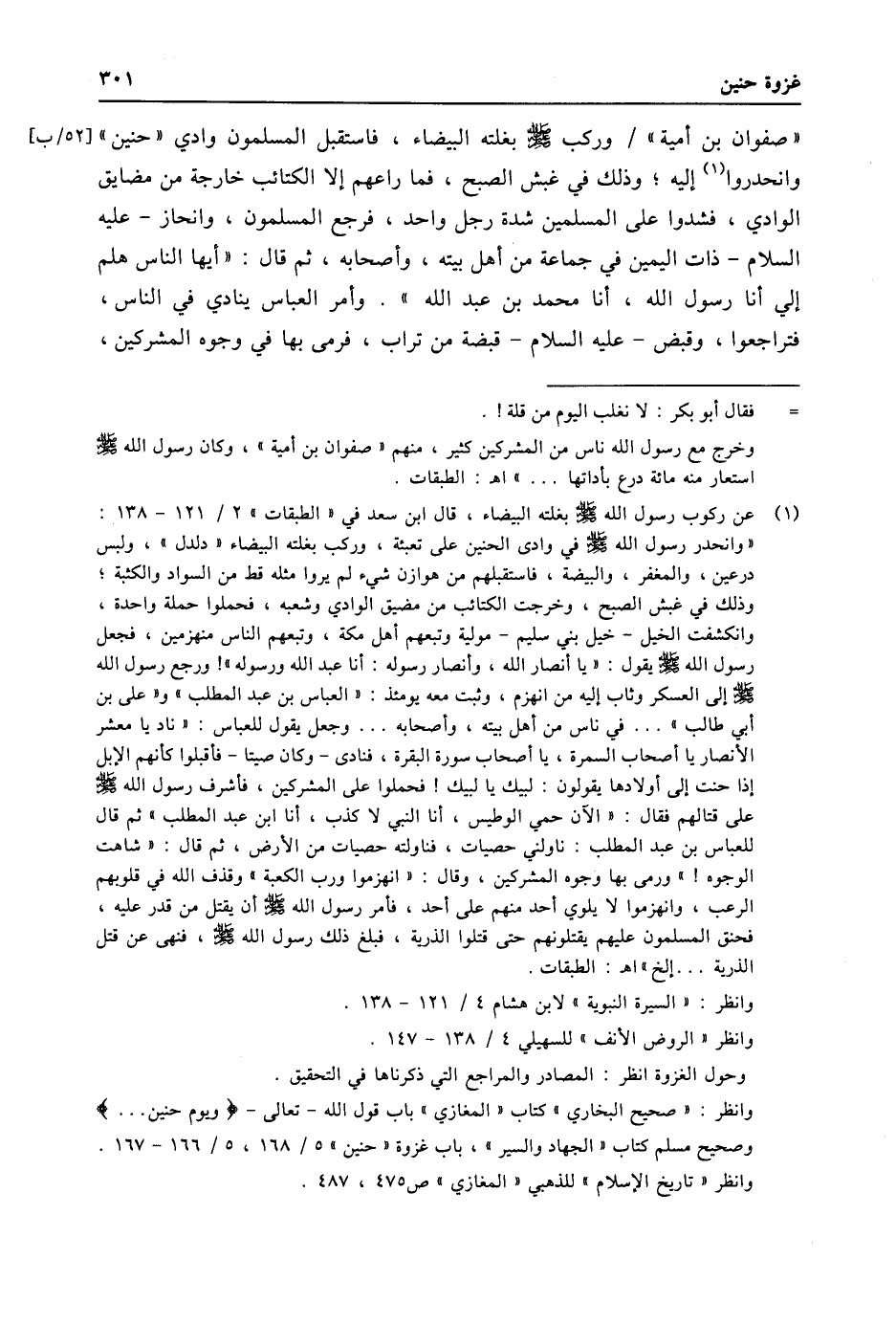 (1) عن ركوب رسول الله صلى الله عليه وسلّم بغلته البيضاء، قال ابن سعد في «الطبقات» 2/ 121- 138: «وانحدر رسول الله صلى الله عليه وسلّم في وادى الحنين على تعبئة، وركب بغلته البيضاء «دلدل» ، ولبس درعين، والمغفر، والبيضة، فاستقبلهم من هوازن شيء لم يروا مثله قط من السواد والكثبة؛ وذلك في غبش الصبح، وخرجت الكتائب من مضيق الوادي وشعبه، فحملوا حملة واحدة، وانكشفت الخيل- خيل بني سليم- مولية وتبعهم أهل مكة، وتبعهم الناس منهزمين، فجعل رسول الله صلى الله عليه وسلّم يقول: «يا أنصار الله، وأنصار رسوله: أنا عبد الله ورسوله» ! ورجع رسول الله صلى الله عليه وسلّم إلى العسكر وثاب إليه من انهزم، وثبت معه يومئذ: «العباس بن عبد المطلب» و «على بن أبي طالب» ... في ناس من أهل بيته، وأصحابه ... وجعل يقول للعباس: «ناد يا معشر الأنصار يا أصحاب السمرة، يا أصحاب سورة البقرة، فنادى- وكان صيتا- فأقبلوا كأنهم الإبل إذا حنت إلى أولادها يقولون: لبيك يا لبيك! فحملوا على المشركين، فأشرف رسول الله صلى الله عليه وسلّم على قتالهم فقال: «الان حمي الوطيس، أنا النبي لا كذب، أنا ابن عبد المطلب» ثم قال للعباس بن عبد المطلب: ناولني حصيات، فناولته حصيات من الأرض، ثم قال: «شاهت الوجوه!» ورمى بها وجوه المشركين، وقال: «انهزموا ورب الكعبة» وقذف الله في قلوبهم الرعب، وانهزموا لا يلوي أحد منهم على أحد، فأمر رسول الله صلى الله عليه وسلّم أن يقتل من قدر عليه، فحنق المسلمون عليهم يقتلونهم حتى قتلوا الذرية، فبلغ ذلك رسول الله صلى الله عليه وسلّم، فنهى عن قتل الذرية ... إلخ» اه: الطبقات. وانظر: «السيرة النبوية» لابن هشام 4/ 121- 138. وانظر: «الروض الأنف» للسهيلي 4/ 138- 147. وحول الغزوة انظر: المصادر والمراجع التي ذكرناها في التحقيق. وانظر: «صحيح البخاري» كتاب «المغازي» باب قول الله- تعالى- وَيَوْمَ حُنَيْنٍ ... وصحيح مسلم كتاب «الجهاد والسير» ، باب غزوة «حنين» 5/ 168، 5/ 166- 167. وانظر «تاريخ الإسلام» للذهبي «المغازي» ص 475، 487.