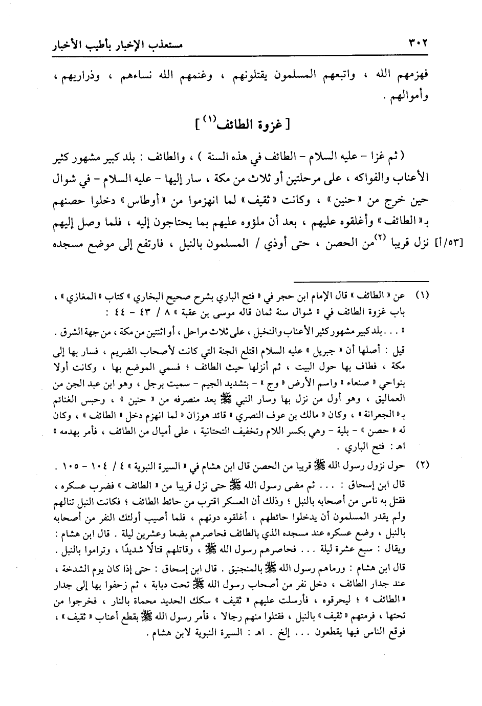 (1) عن «الطائف» قال الإمام ابن حجر في «فتح الباري بشرح صحيح البخاري» كتاب «المغازي» ، باب غزوة الطائف في «شوال سنة ثمان قاله موسى بن عقبة» 8/ 43- 44: « ... بلد كبير مشهور كثير الأعناب والنخيل، على ثلاث مراحل، أو اثنتين من مكة، من جهة الشرق. قيل: أصلها أن «جبريل» عليه السلام اقتلع الجنة التي كانت لأصحاب الضريم، فسار بها إلى مكة، فطاف بها حول البيت، ثم أنزلها حيث الطائف؛ فسمي الموضع بها، وكانت أولا بنواحي «صنعاء» واسم الأرض «وج» - بتشديد الجيم- سميت برجل، وهو ابن عبد الجن من العماليق، وهو أول من نزل بها وسار النبي صلى الله عليه وسلّم بعد منصرفه من «حنين» ، وحبس الغنائم ب «الجعرانة» ، وكان «مالك بن عوف النصري» قائد هوزان «لما انهزم دخل «الطائف» ، وكان له «حصن» - بلية- وهي بكسر اللام وتخفيف التحتانية، على أميال من الطائف، فأمر بهدمه» اه: فتح الباري.
