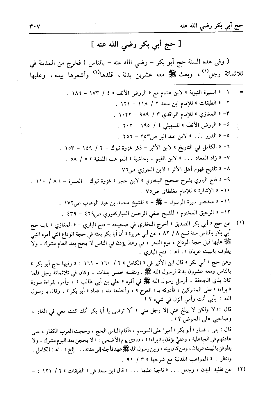 (1) عن حج «أبي بكر الصديق» أخرج البخاري في صحيحه- فتح الباري- «المغازي» باب حج أبي بكر بالناس سنة تسع 8/ 82، عن أبي هريرة «أن أبا بكر بعثه في حجة الوداع التي أمره النبي صلى الله عليه وسلّم عليها قبل حجة الوداع، يوم النحر، في رهط يؤذن في الناس لا يحج بعد العام مشرك، ولا يطوف بالبيت عريان» . اه: فتح الباري. وعن حج «أبي بكر» قال ابن الأثير في «الكامل» 2/ 160- 161: «وفيها حج أبو بكر» بالناس ومعه عشرون بدنة لرسول الله صلى الله عليه وسلّم، ولنفسه خمس بدنات، وكان في ثلاثمائة رجل فلما كان بذي الجحفة، أرسل رسول الله صلى الله عليه وسلّم في أثره «علي بن أبي طالب» ، وأمر بقراءة سورة «براءة» على المشركين، فأدركه ب «العرج» ، وأخذها منه، فعاد «أبو بكر» ، وقال يا رسول الله: بأبي أنت وأمي أنزل في شيء؟! قال: «لا ولكن لا يبلغ عني إلا رجل مني؛ ألا ترضى يا أبا بكر أنك كنت معي في الغار، وصاحبي على الحوض؟» . قال: بلى. فسار «أبو بكر» أميرا على الموسم، فأقام الناس الحج، وحجت العرب الكفار، على عادتهم في الجاهلية، وعليّ يؤذن ب «براءة» ، فنادى يوم الأضحى: «لا يحجن بعد اليوم مشرك، ولا يطوفن بالبيت عريان، ومن كان بينه، وبين رسول الله صلى الله عليه وسلّم عهد فأجله إلى مدته ... إلخ» . اه: الكامل. وانظر: «المواهب اللدنية مع شرحها» 3/ 91.
