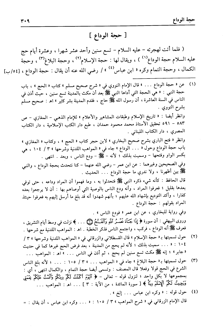 (3) حول تسميتها ب «حجة البلاغ» جاء في «المواهب ... » 3/ 105: ... ؛ لأنه بلغ الناس الشرع في الحج قولا وفعلا قال المصنف: وتسمى أيضا حجة التمام، والكمال انتهى، أي: بمجموعها لا بكل واحد؛ لنزول قوله- تعالى- الْيَوْمَ أَكْمَلْتُ لَكُمْ دِينَكُمْ وَأَتْمَمْتُ عَلَيْكُمْ نِعْمَتِي وَرَضِيتُ لَكُمُ الْإِسْلامَ دِيناً [سورة المائدة، من الاية: 3] ... اه: المواهب ...