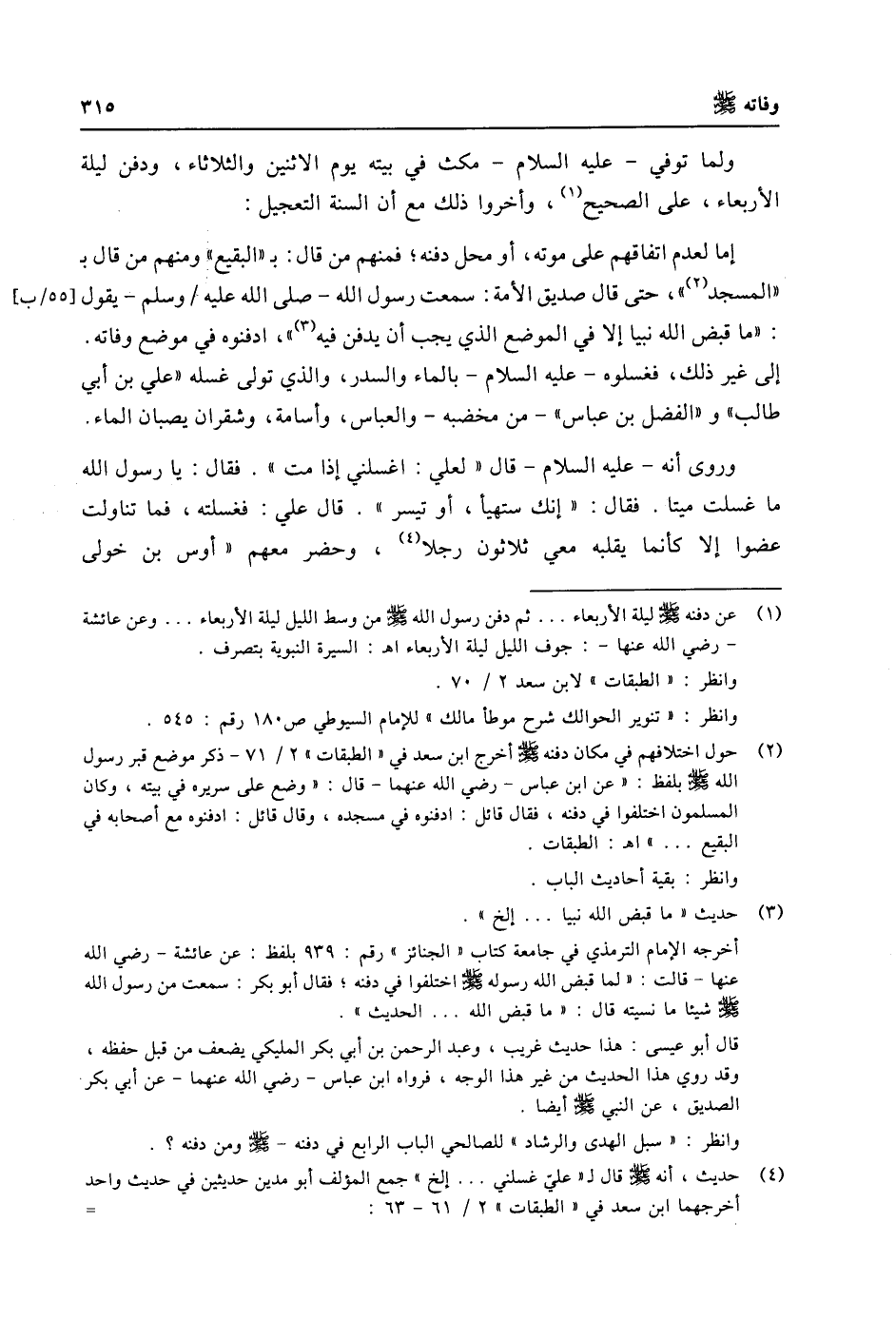 (1) عن دفنه صلى الله عليه وسلّم ليلة الأربعاء ... ثم دفن رسول الله صلى الله عليه وسلّم من وسط الليل ليلة الأربعاء ... وعن عائشة- رضي الله عنها-: جوف الليل ليلة الأربعاء اه: السيرة النبوية بتصرف. وانظر: «الطبقات» لابن سعد 2/ 70. وانظر: «تنوير الحوالك شرح موطأ مالك» للإمام السيوطي ص 180 رقم: 545.