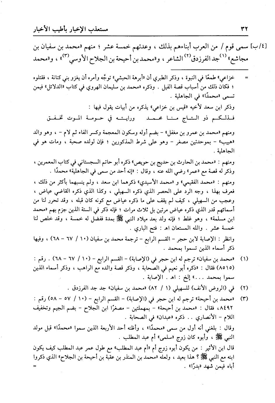 (3) «محمد بن أحيحة» ترجم له ابن حجر في (الإصابة) - القسم الرابع- (10/ 57- 58) رقم: 8492، فقال: «محمد بن أحيحة» - بمهملتين- مصغرا ابن الجلاح- بضم الجيم وتخفيف اللام- الأنصاري.. ذكره «عبدان» في الصحابة. وقال: بلغني أنه أول من سمى «محمدا» ، وأظنه أحد الأربعة الذين سموا «محمدا» قبل مولد النبي صلى الله عليه وسلّم، وأبوه كان زوج «سلمى» أم عبد المطلب. قال ابن الأثير: من يكون أبوه زوج أم «أم عبد المطلب» مع طول عمر عبد المطلب كيف يكون ابنه مع النبي صلى الله عليه وسلّم؟ هذا بعيد، ولعله «محمد بن المنذر بن عقبة بن أحيحة بن الجلاح» الذي ذكروا أباه فيمن شهد «بدرا» .