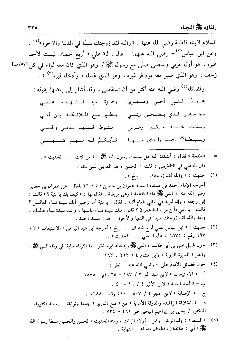 (1) حديث: «والله لقد زوجتك ... إلخ» . أخرجه الإمام أحمد في مسنده «مسند عمران بن حصين» 5/ 26 بلفظ: عن عمران بن حصين رضي الله عنه- أن النبي صلى الله عليه وسلّم عاد «فاطمة» وهى مريضة، فقال لها: «كيف بك يا بنية؟» قالت: إني وجعة، وإنه ليزيد في آمالي طعام آكله، فقال: يا بنية أما ترضين أنك سيدة نساء العالمين؟ قالت: يا أبتي فأين مريم ابنة عمران؟ قال: تلك سيدة نساء عالمها، وأنت سيدة نساء عالمك، وأما والله لقد زوجتك سيدا في الدنيا والاخرة. اه: مسند أحمد.