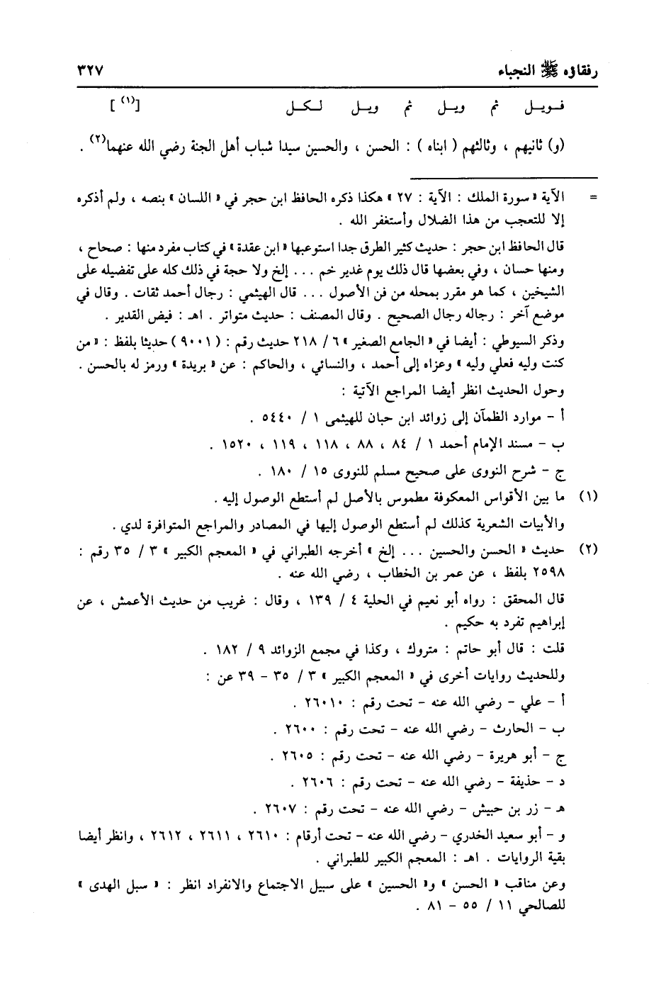 - الاية «سورة الملك: الاية: 27» هكذا ذكره الحافظ ابن حجر في «اللسان» بنصه، ولم أذكره إلا للتعجب من هذا الضلال وأستغفر الله. قال الحافظ ابن حجر: حديث كثير الطرق جدا استوعبها «ابن عقدة» في كتاب مفرد منها: صحاح، ومنها حسان، وفي بعضها قال ذلك يوم غدير خم ... إلخ ولا حجة في ذلك كله على تفضيله على الشيخين، كما هو مقرر بمحله من فن الأصول ... قال الهيثمي: رجال أحمد ثقات. وقال في موضع آخر: رجاله رجال الصحيح. وقال المصنف: حديث متواتر. اه: فيض القدير. وذكر السيوطي: أيضا في «الجامع الصغير» 6/ 218 حديث رقم: (9001) حديثا بلفظ: «من كنت وليه فعلي وليه» وعزاه إلى أحمد، والنسائي، والحاكم: عن «بريدة» ورمز له بالحسن. وحول الحديث انظر أيضا المراجع الاتية: أ- موارد الظمان إلى زوائد ابن حبان للهيثمى 1/ 5440. ب- مسند الإمام أحمد 1/ 84، 88، 118، 119، 1520. ج- شرح النووى على صحيح مسلم للنووى 15/ 180.